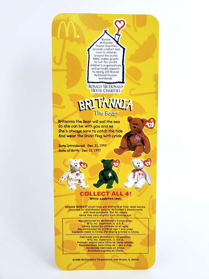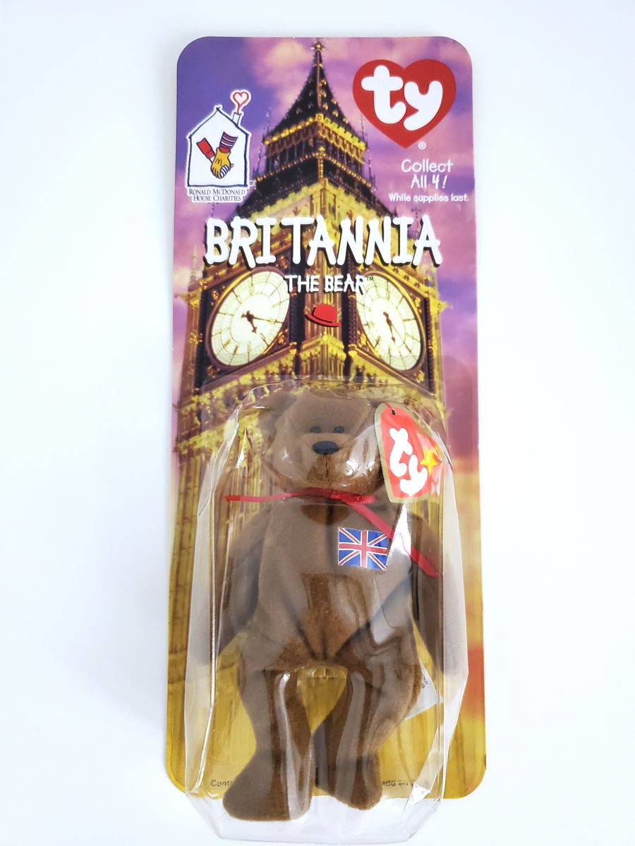 Ronald McDonald House “Britannia the Bear” collectible from Ty Teenie Beanie Babies 1999 “International Bears” collection.