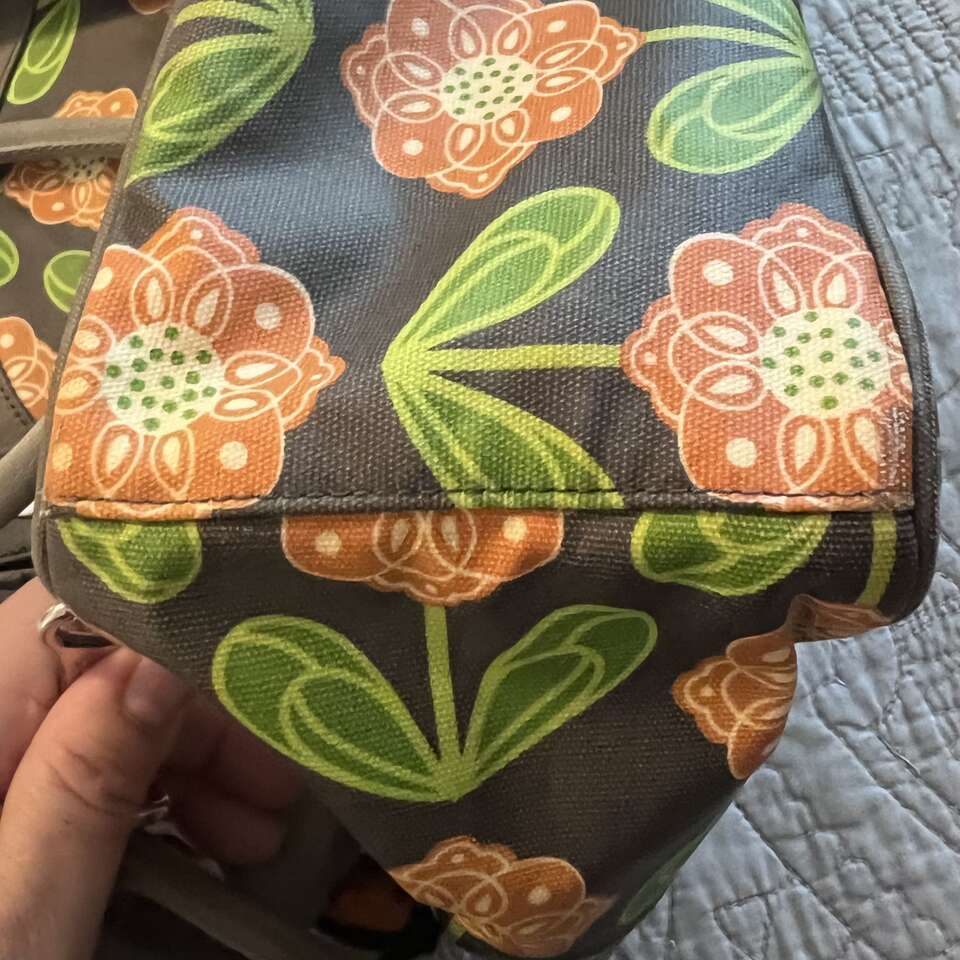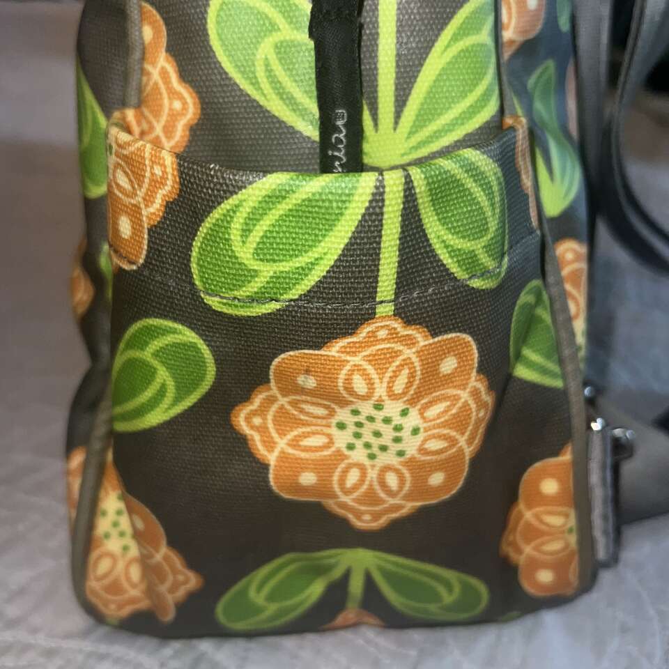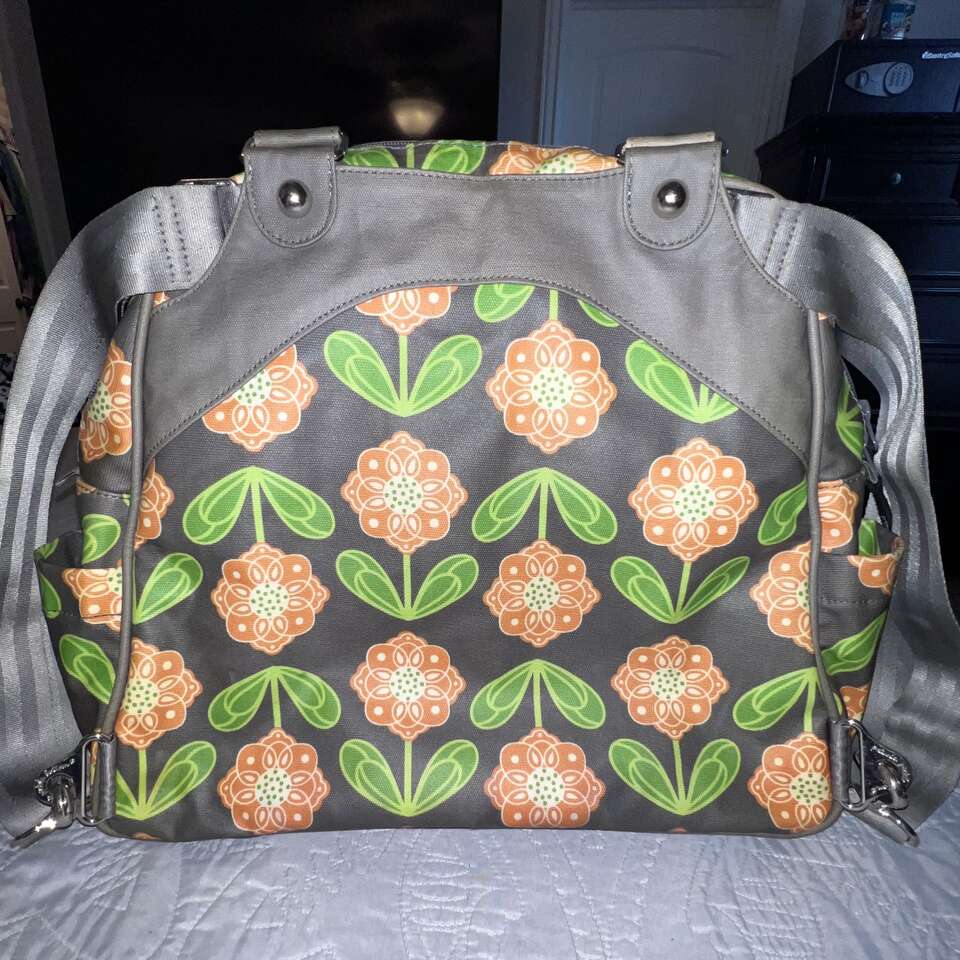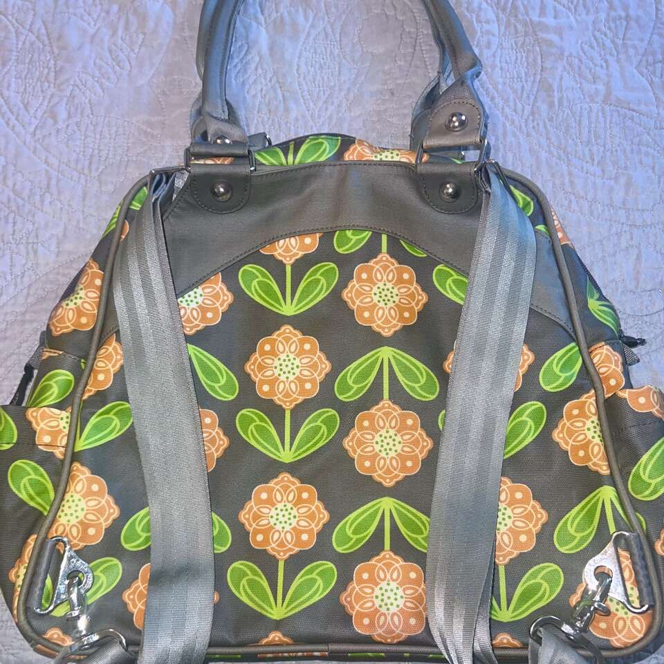ApplePayPRICE REDUCED TO $40 FIRM! This is such a durable and beautiful bag! The bag has 3 large compartments. The center compartment is the largest and has a zipper pocket on one side, two large slip pockets on the other side and two elastic pockets on each end. It also has an attached clip for your keys. The outer compartment that is on the logo side of the bag has 1 slip pocket, it also has a hidden magnetic closure. The compartment on the other side is where you can tuck the back pack straps when carrying by the handles. (back pack straps attached at upper portion of bag, just unclip at bottom. If wearing as a back pack, tuck the handles into each side compartment) The back pack straps are adjustable, pliable and comfortable. It came with a changing pad, which I am not including, as I feel that most will want to buy a new one if using as a diaper bag. You can get them on Amazon for a good price. As for condition, it's in really great shape with a few minor mentionables. There a few light ink marks in the center compartment that won't come out, but they are not visible to anyone unless they are looking for them inside the bag. There are no tears or rips. The exterior is in really great shape with only slight scuffing on one side of bottom corners of the bag, barely noticeable. No tears, cuts or major issues. I'm being very transparent, so there are no surprises. See pics and please ask questions! 15 length, 14 height, 5.5 depth at bottom (depth slowly decreases as you get to the top; 2.75 at top) 10 handle drop
