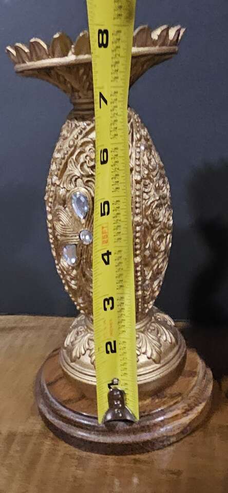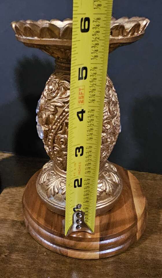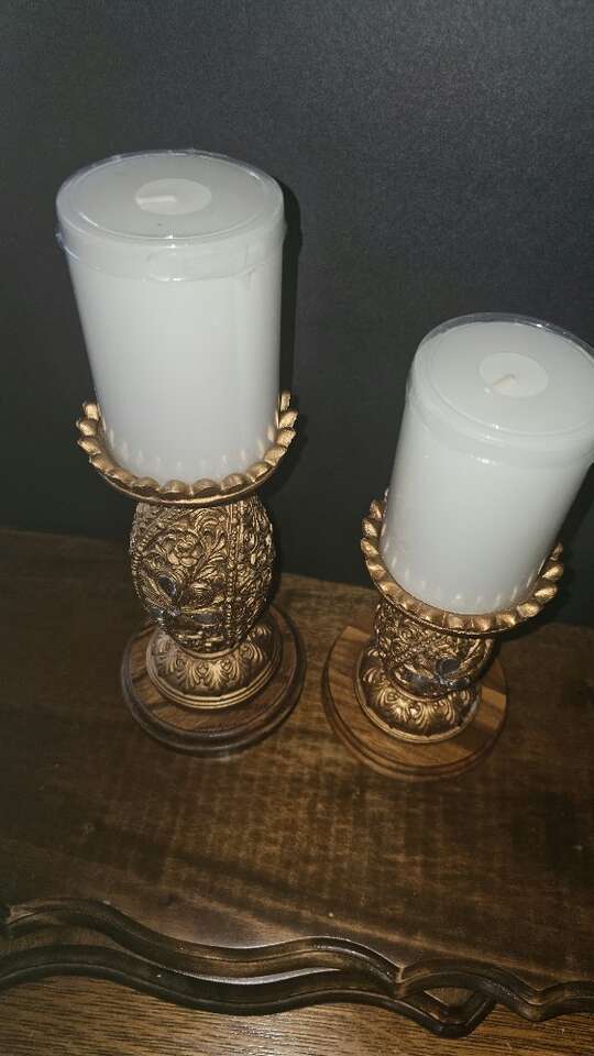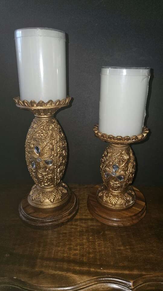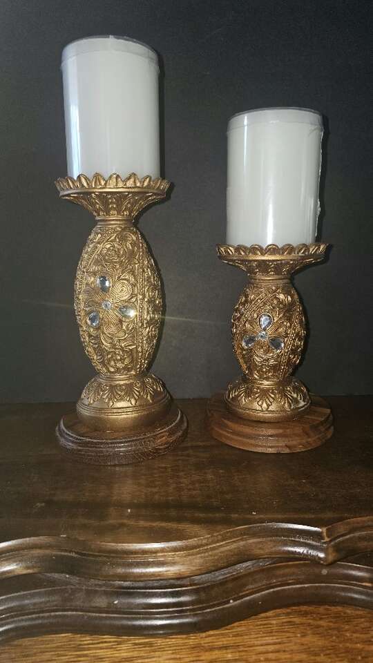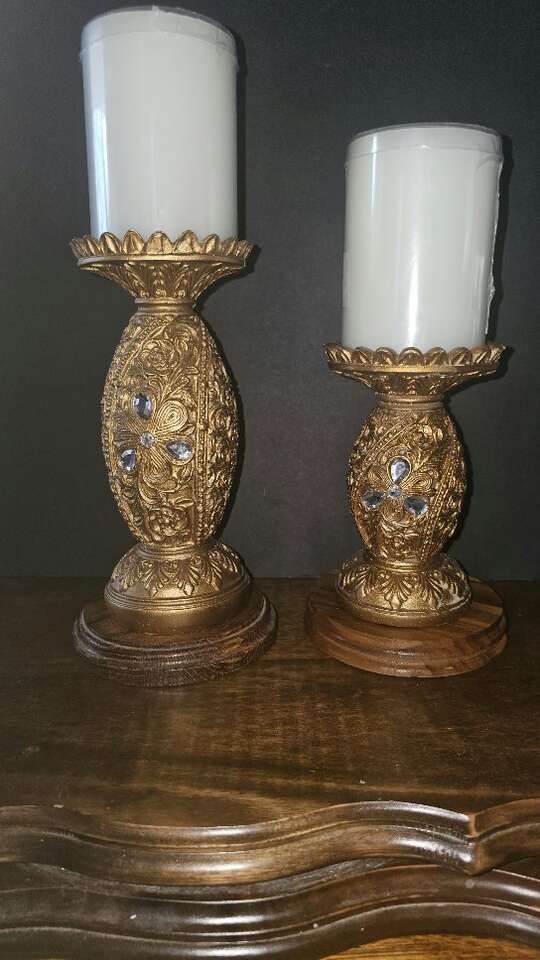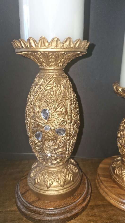 Two really pretty gold resin candlesticks (6" and 8"), with tear drop accents in a floral pattern and glittery finish.
