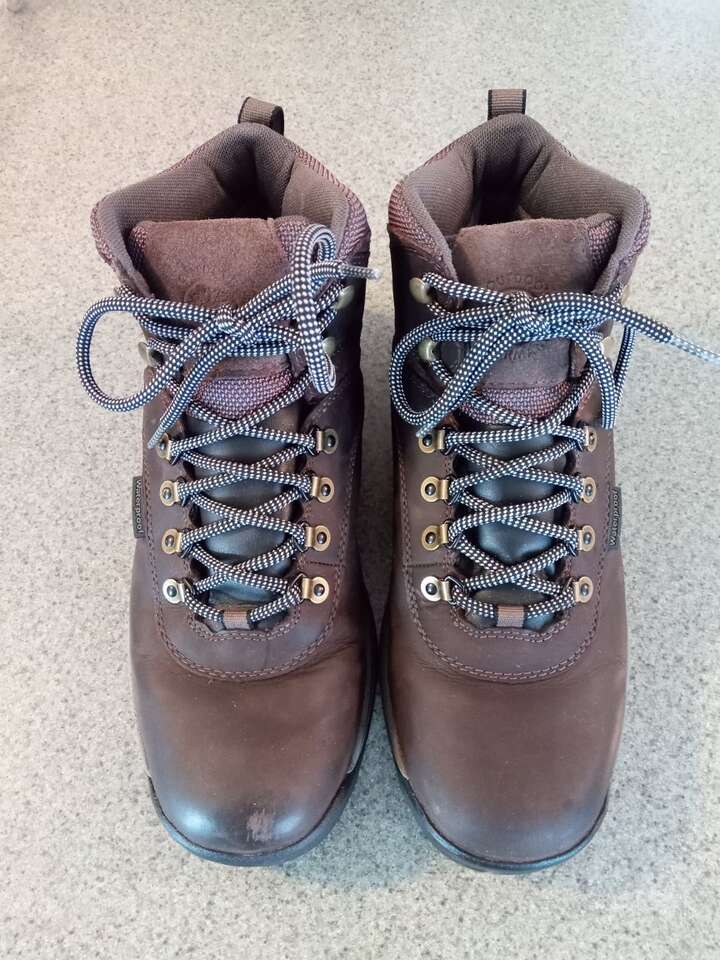 Price Reduced Again This is a pair of like new men's size 10 Timberland boots in brown leather. They are waterproof with a gusseted tongue, which is padded at the top. They have two speed hooks and rear boot pull. They were only worn a couple of times in an indoor office environment. They are in like new condition, with box, and from a smoke-free home. Cash or Venmo only.