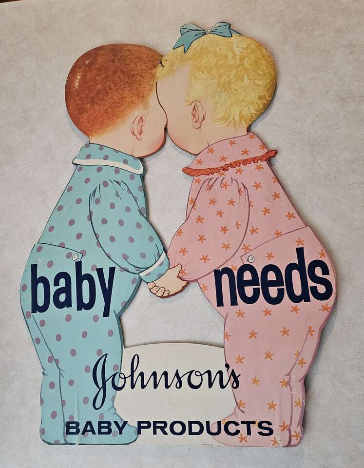 VenmoOffering this large adorable point of purchase sign for Johnson's Baby Products. It measures 28.5" tall x 20.5" wide. It's in nice vintage condition with minor signs of age related wear. It can hang, wall mount or be propped up on wires. Located in Sandy.