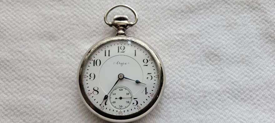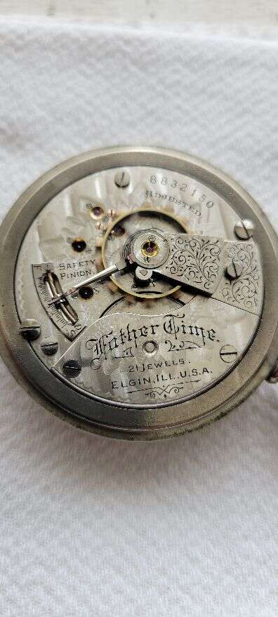 I’m selling this nice used vintage 18 size, 21 Jewel, Elgin Father Time railroad grade pocket watch. The watch is in running condition and keeping time. The watch was recently cleaned. The watch is in a nickel case. The watch has glass crystal, and it has a chip. The watch has a nice double sunk dial with some hairline. Based on the serial number (8832150), the watch was made in 1900. The watch and has been carried but still a descent example of an Elgin railroad grade pocket watch. The Elgin Father Time was one of Elgin’s highest grades.