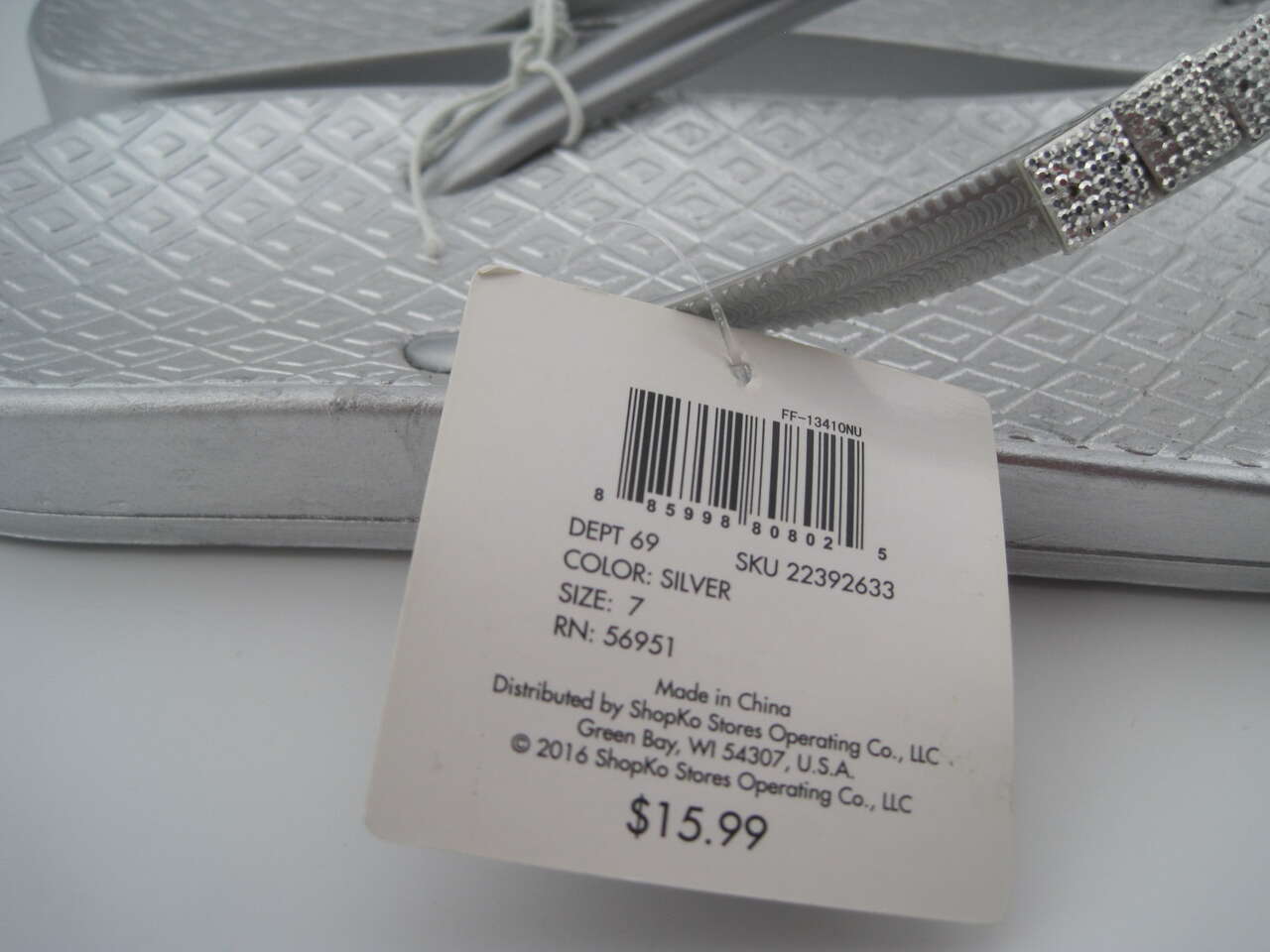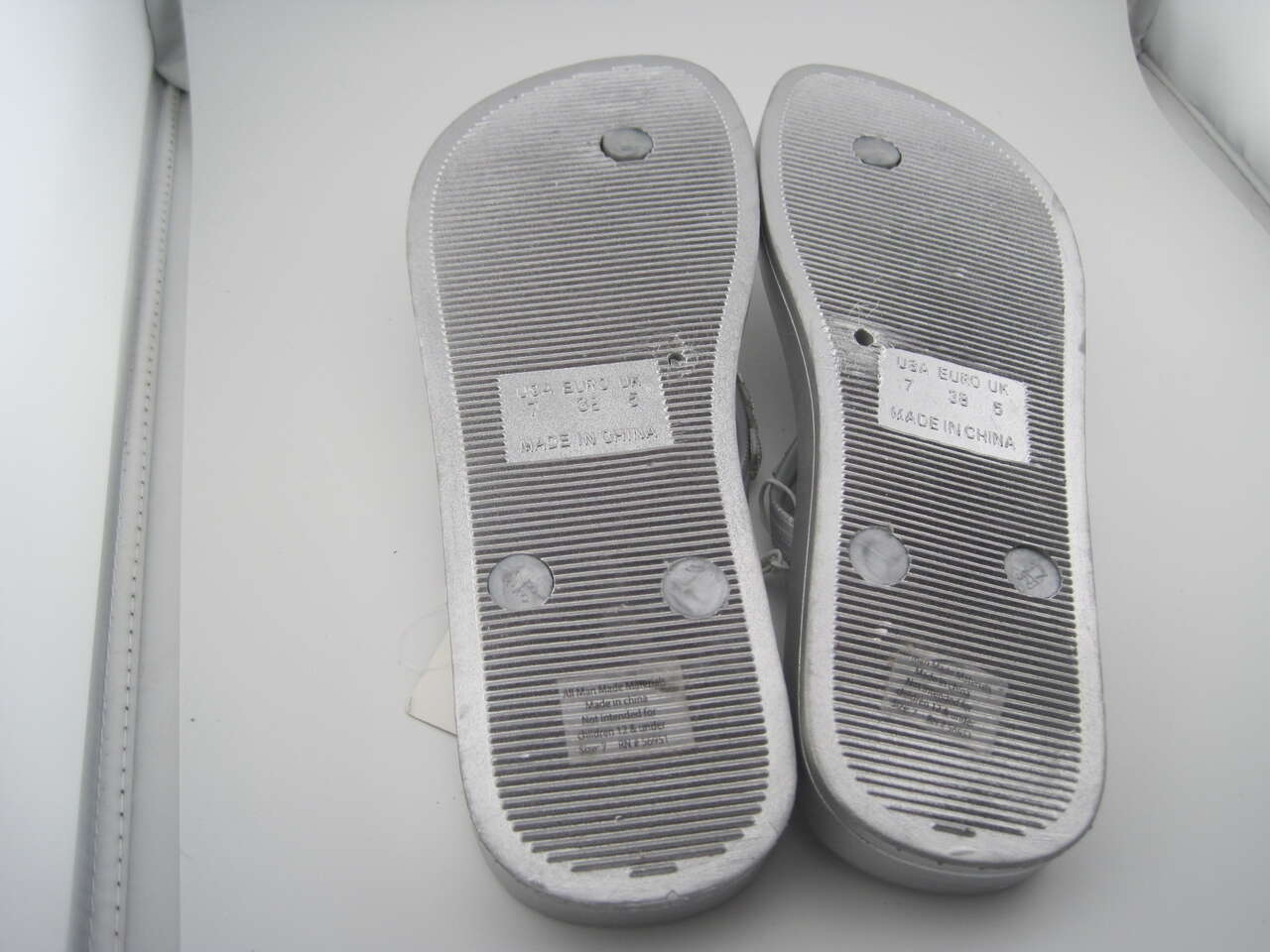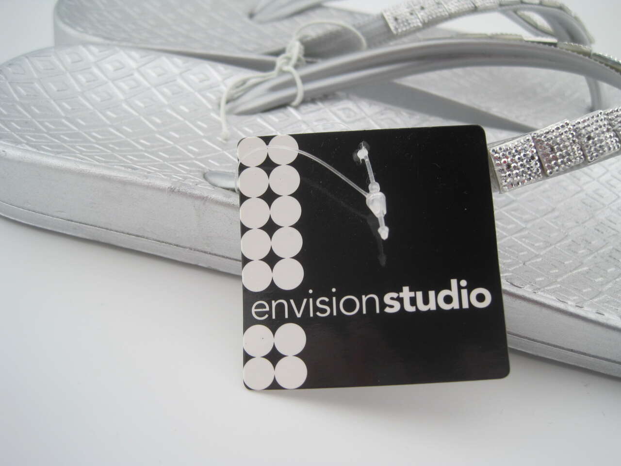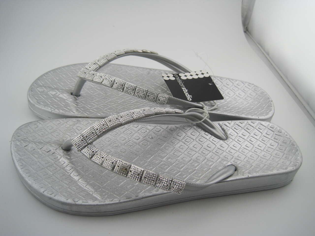 Add a touch of glam to your summer wardrobe with these Envision Studio silver flip flops. The rhinestone accents on the straps will make you shine in the sun. They are perfect for casual occasions and are designed with slip-on closure for easy wear. These lightweight and breathable sandals are made with synthetic upper material and rubber outsole material. They have a flat heel style and insole made of rubber for extra comfort. Available in UK shoe size 5, US shoe size 7, or EU shoe size 38, these Envision Studio flip flops are a must-have for your summer collection.