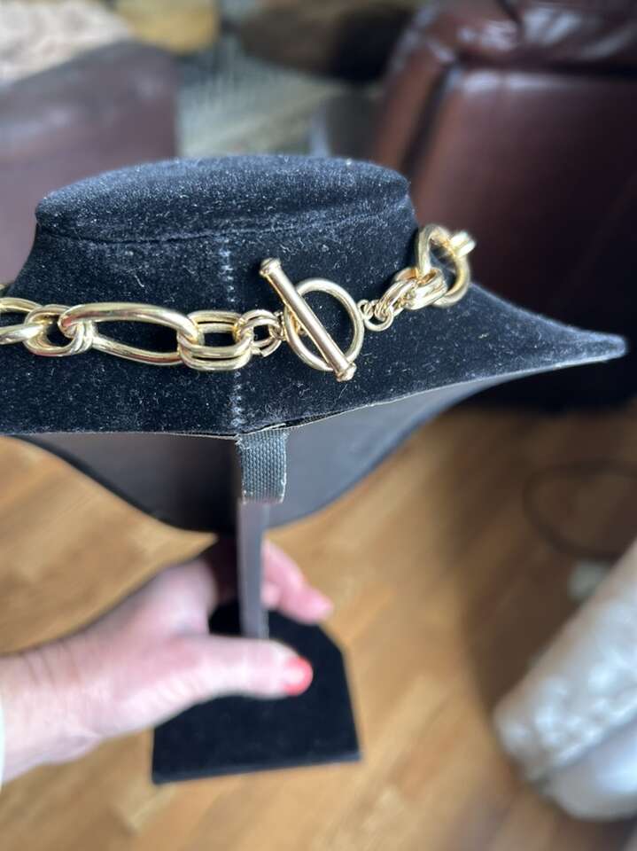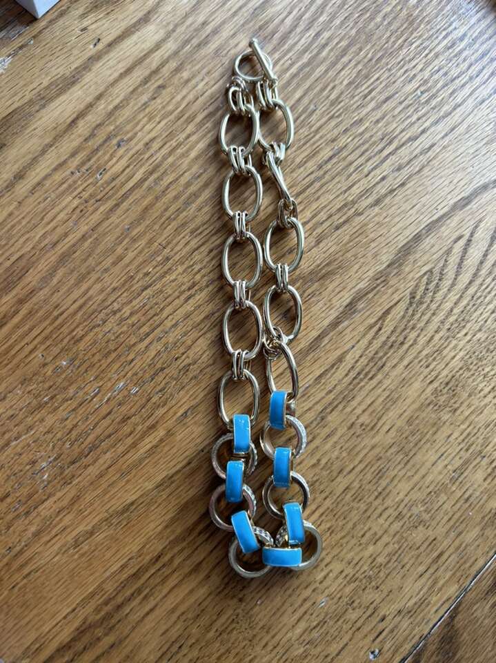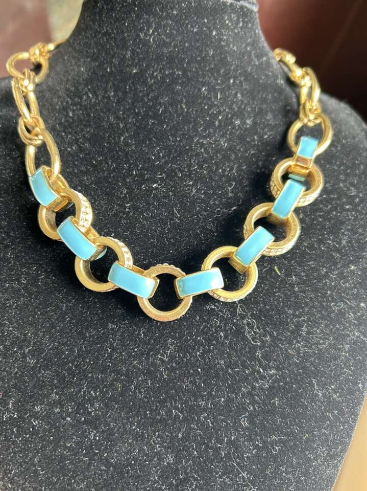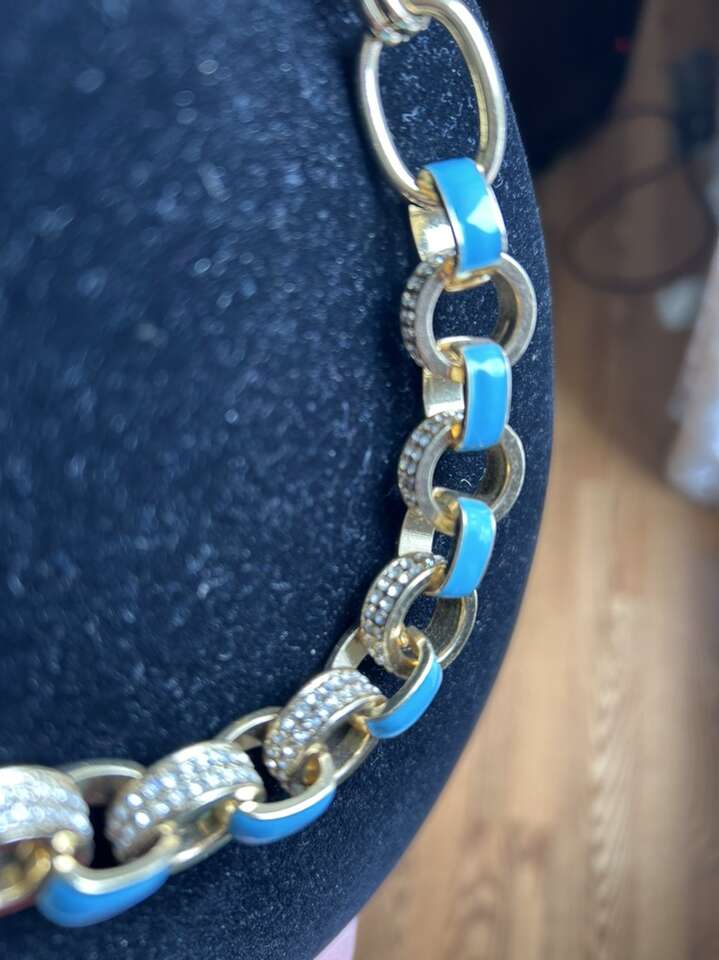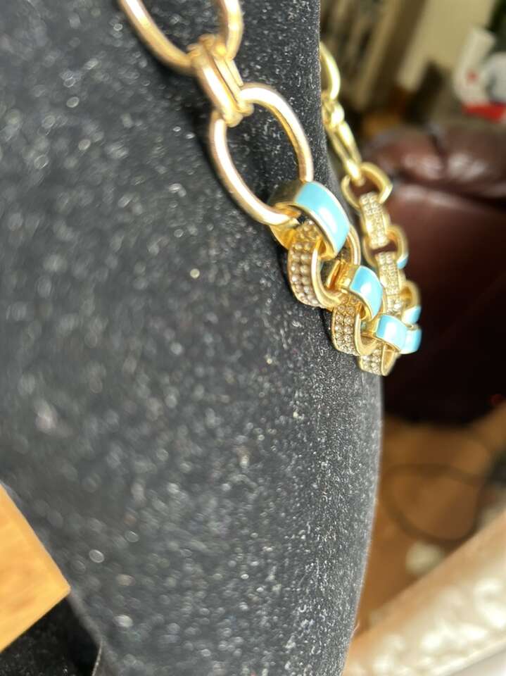 Like new gold tone, links and paper, clips style necklace with cubic zirconium and light turquoise blue enamel accents. Beautiful classic luxury styling. This is not real gold. Circle and bar closure at the neck. Measures 19 inches long. In great new condition. Clean clean, non-smoking home. Alternating link sizes. Beautiful statement piece. Cash or Venmo. Porch pick up from Alpine.
