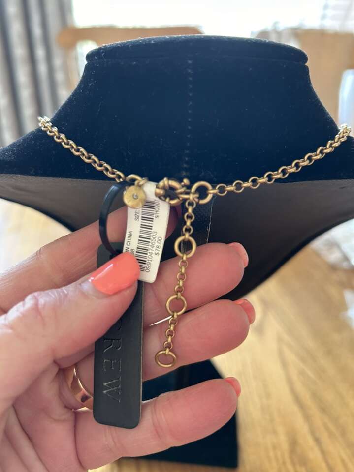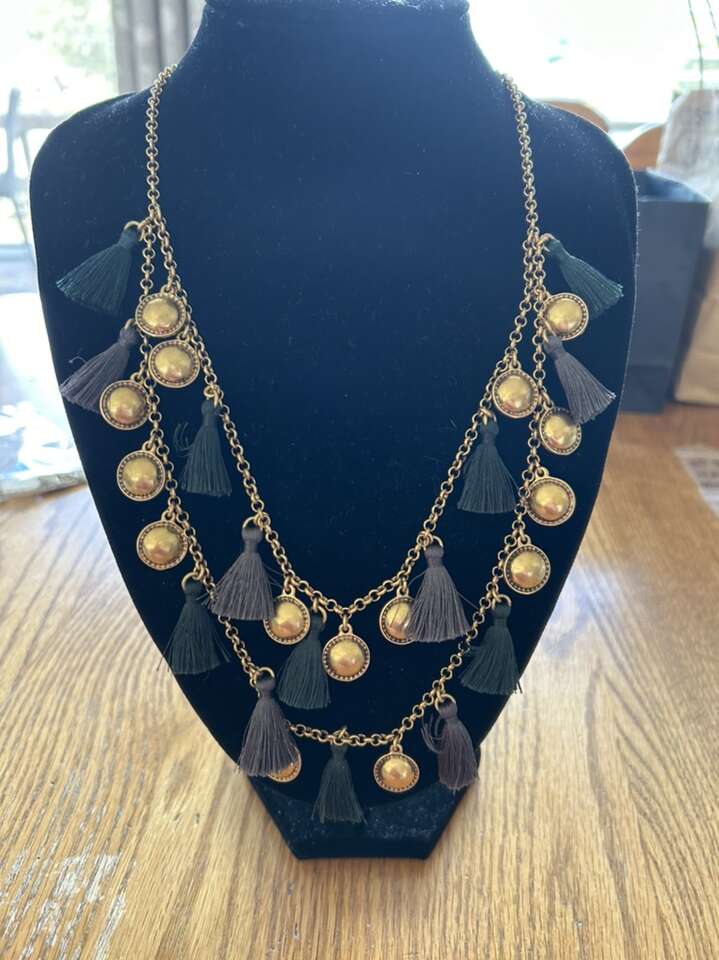 VenmoNew with tags, J.Crew brass gold tone, tassel necklace. Tassels are a dark forest, green and a dark charcoal gray. Original tags are still on. Double layer. Measure 24 to 26 inches. Clean non-smoking home. porch pick up from Alpine. cash or Venmo.