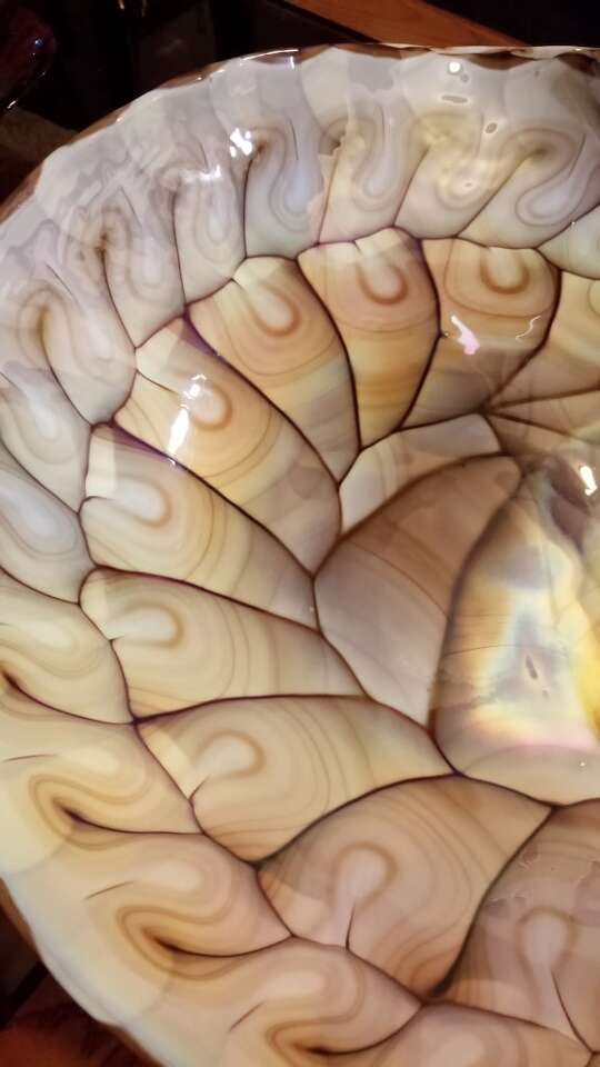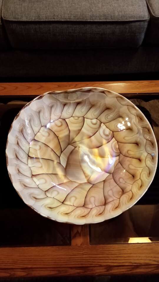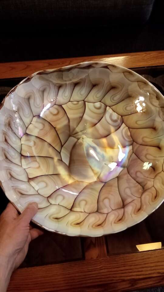 How beautiful is this rare and stunning vintage hand blown iridescent Murano shell glass plate and is approximately 20"across and just under 4" deep and I am way way under current market value on this beautiful elegant piece and you'll see that in the 2nd photo and this piece literally comes alive and is so beautiful. And if you get a chance please check out the other things that are on my seller site thank you.