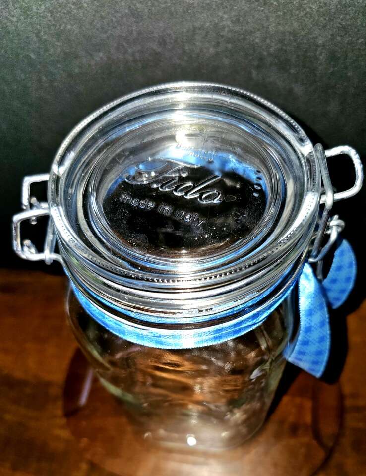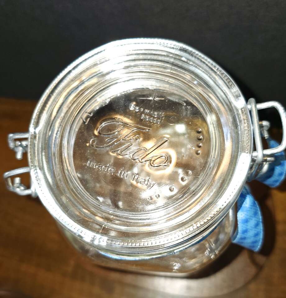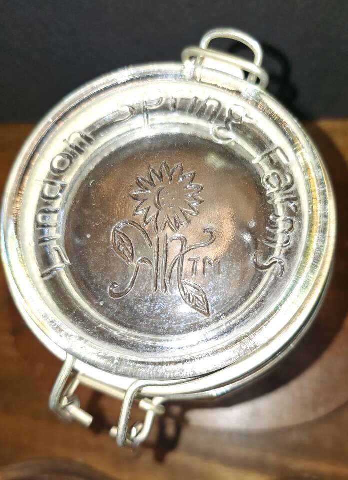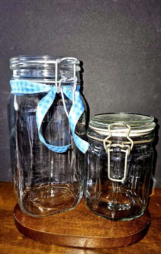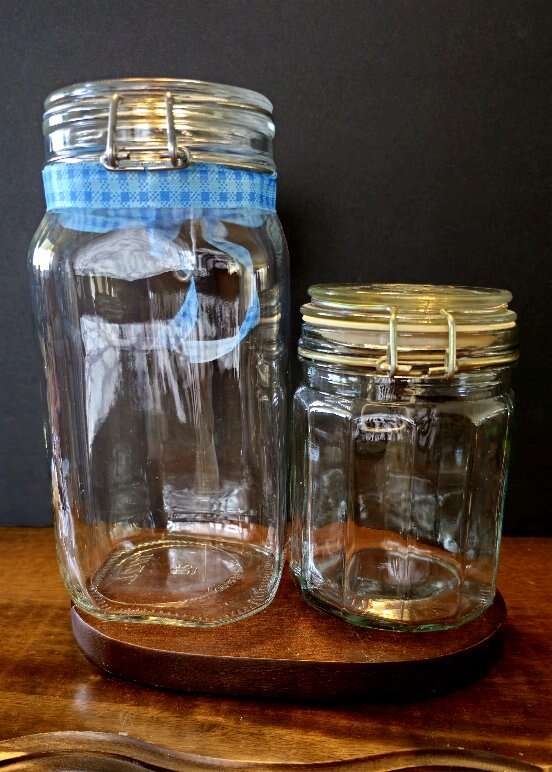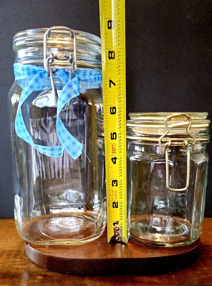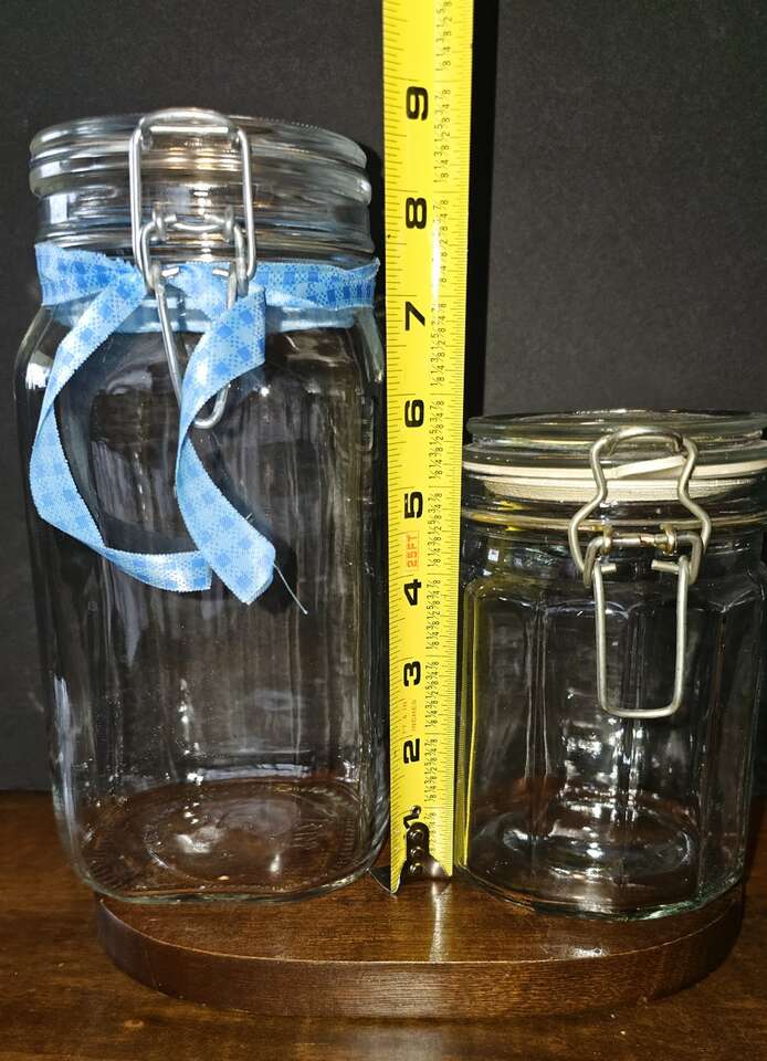Two name brand vintage glass jars, canister style, with flip top wire bail closure.