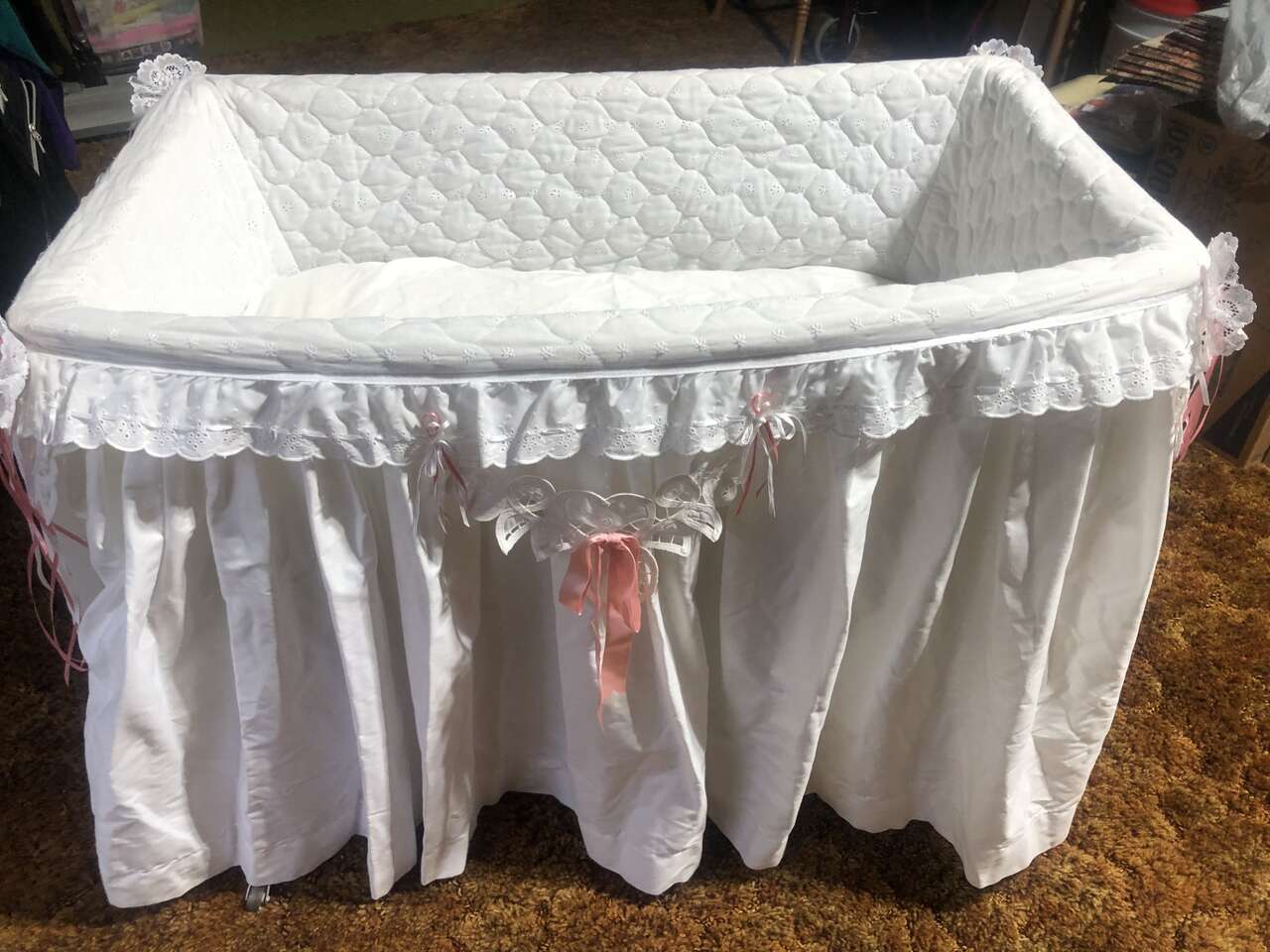 VenmoVery old baby basinette. Made of wicker. Includes mattress with cover. White linen cover for the basinette has pink ribbon trim (sorry for the photo, the cover needs ironing but is in great shape). Basinette itself comes in two pieces and is in excellent condition.