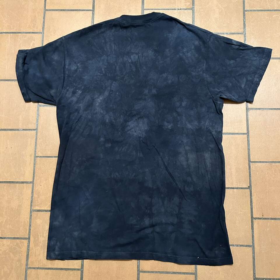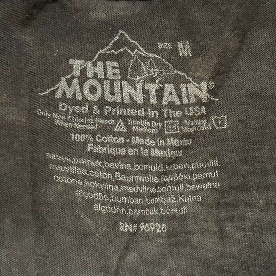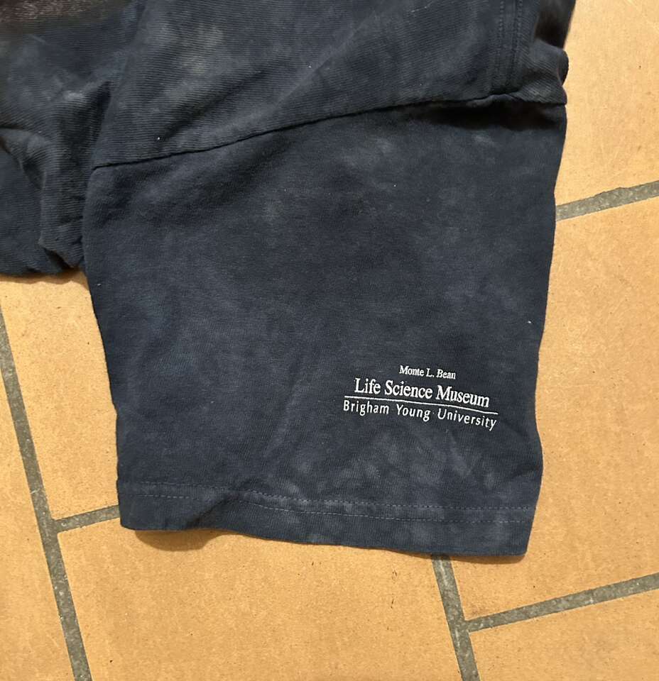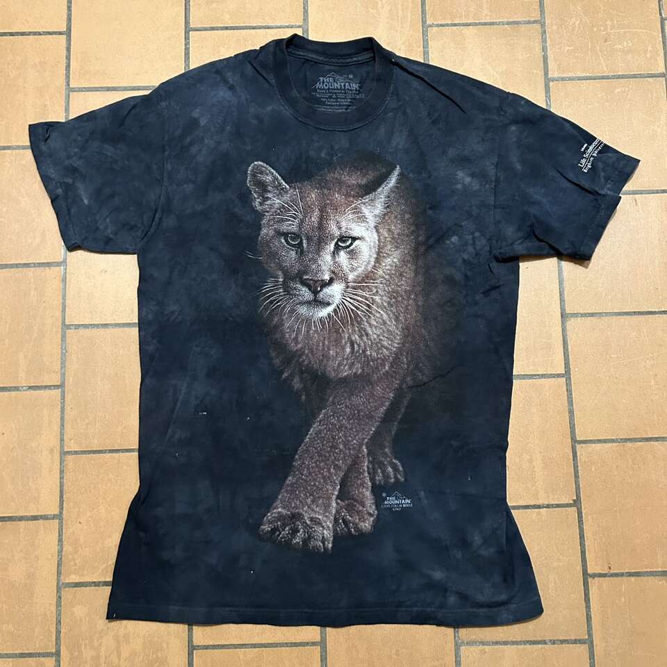 Gently used unisex Dramatic Cougar T-Shirt: The Mountain copyright 2015 Colin Bogle. 100% cotton black tie-dye shirt with greenish grey tint. Size Medium. Made in Mexico. Monte L. Bean Life Science Museum printed on one sleeve. Casual Streetwear Animal print. Delivery available to a convenient location when in your area for $5.