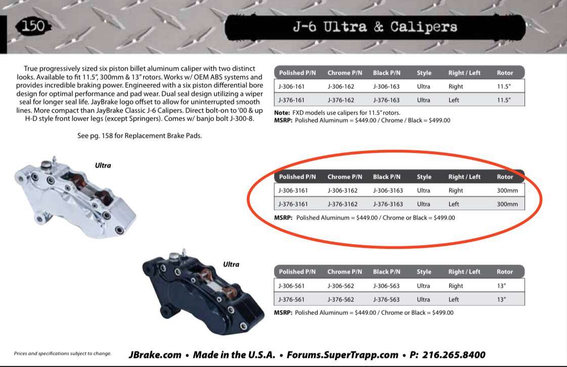 JayBrake J-6 Ultra Harley-Davidson Brake Calipers - 6 Piston for 300mm (11.8”) rotors.