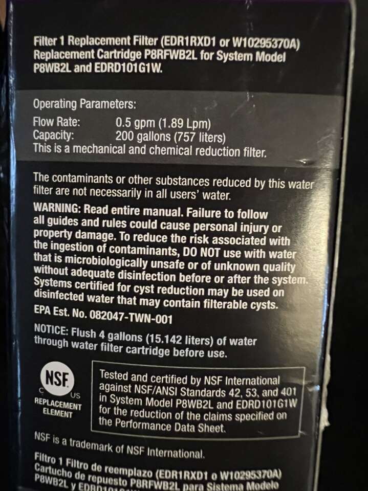 Filter 1 Replacement Filter (EDR1RD1 or W10295370A) Replacement Cartridge P8RFWB2L for System Model P8WB2L and EDRD101G1W.