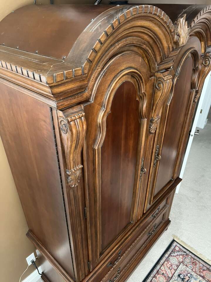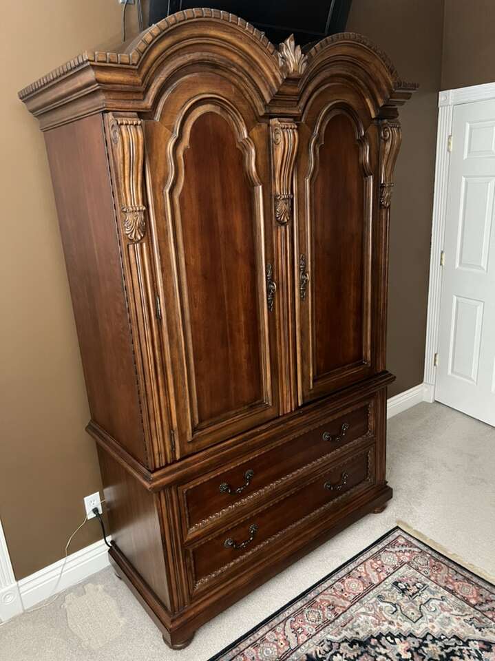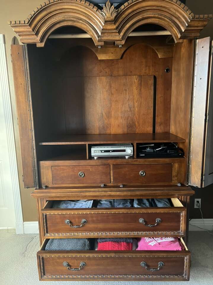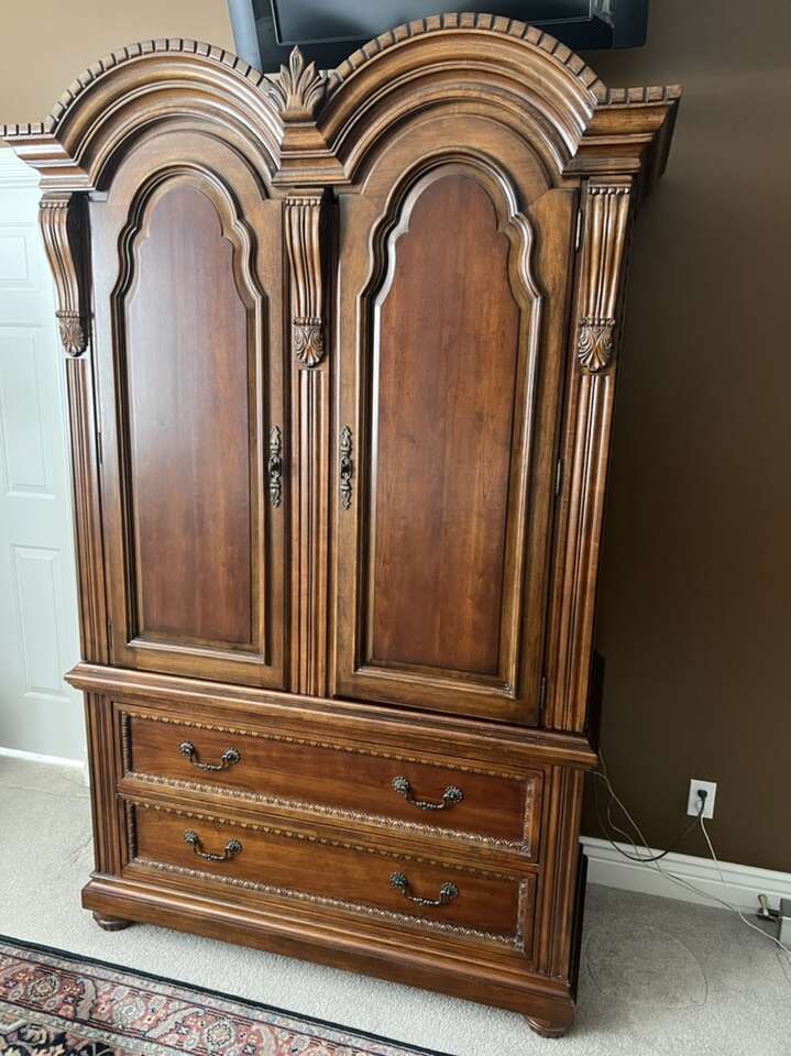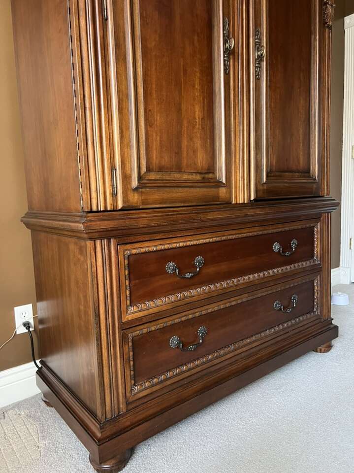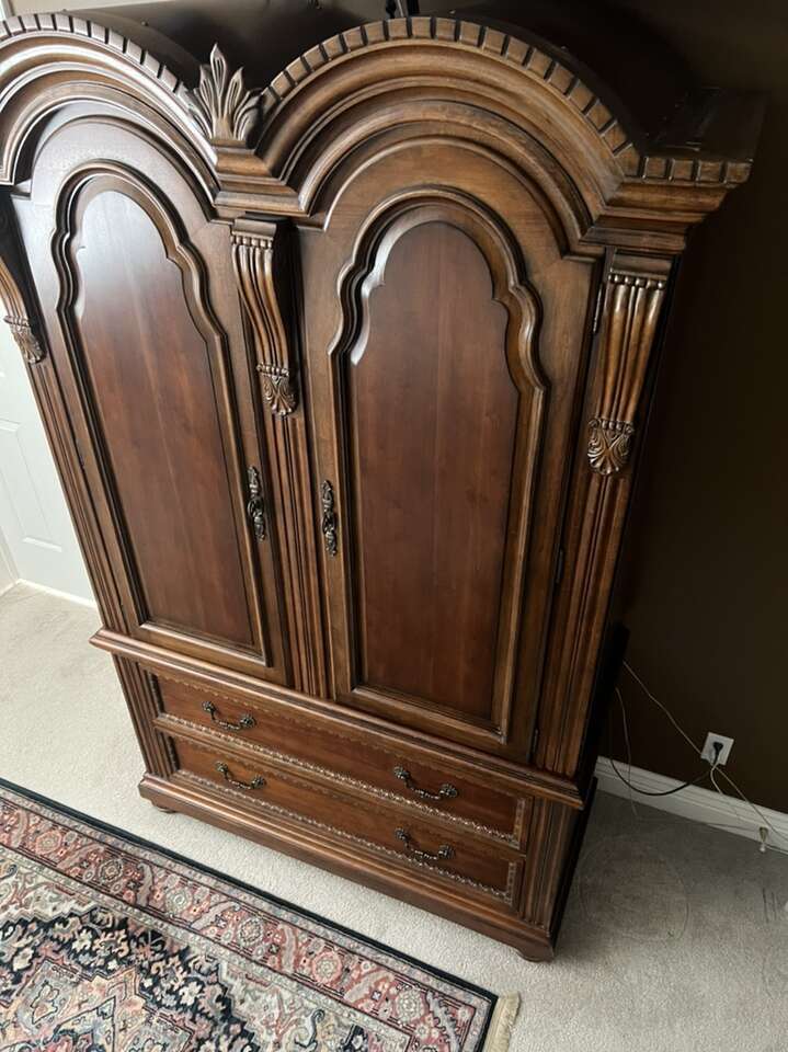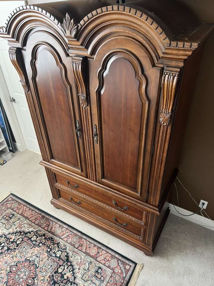 Beautiful high quality solid wood armoire with lower dresser drawers. The decorative trim and craftsmanship is amazing. No lightweight wood or particle board. There are two removable closet rods, three shelf-compartments, two internal drawers, and two large external drawers. If you’re looking for lightweight cheap furniture, this is not it. This is a two piece unit (easier to carry and transport). The top 56” piece will separate from the bottom 29” piece. Total dimensions are 85” tall x 54.5” wide x 24” deep.