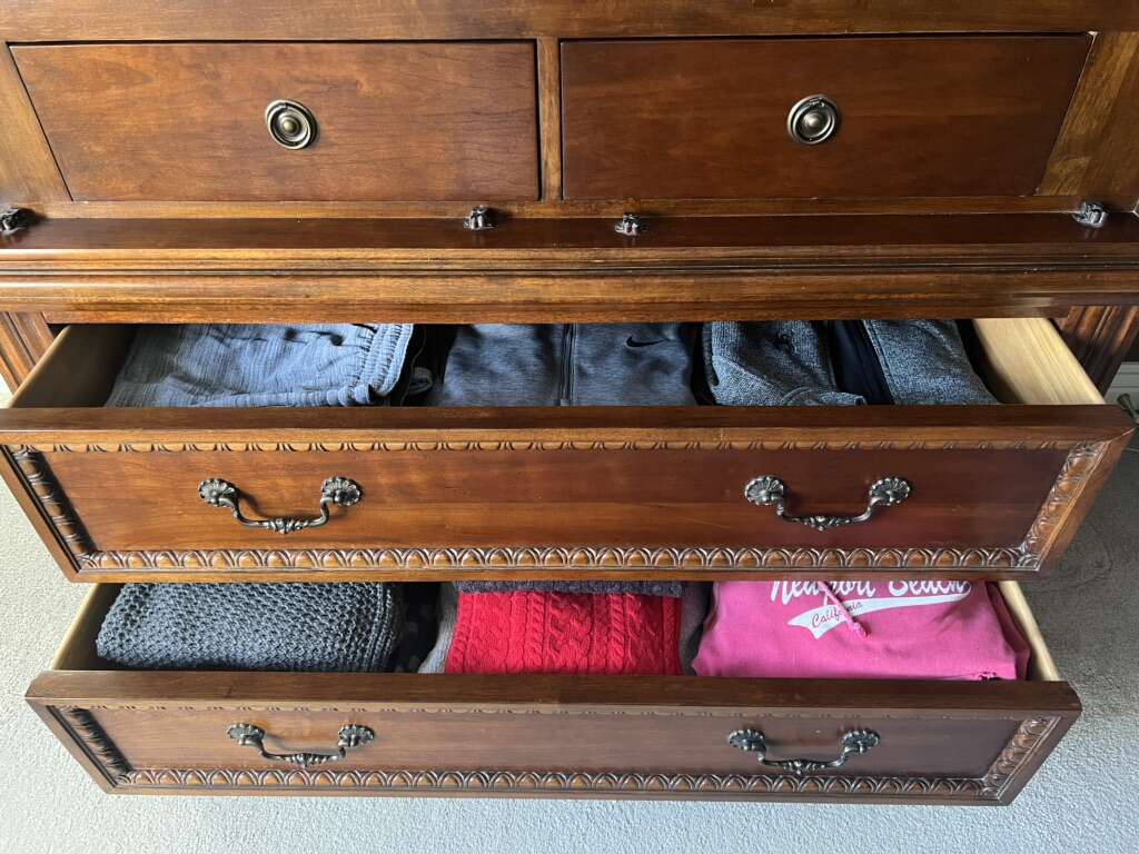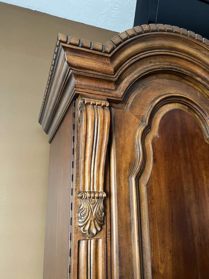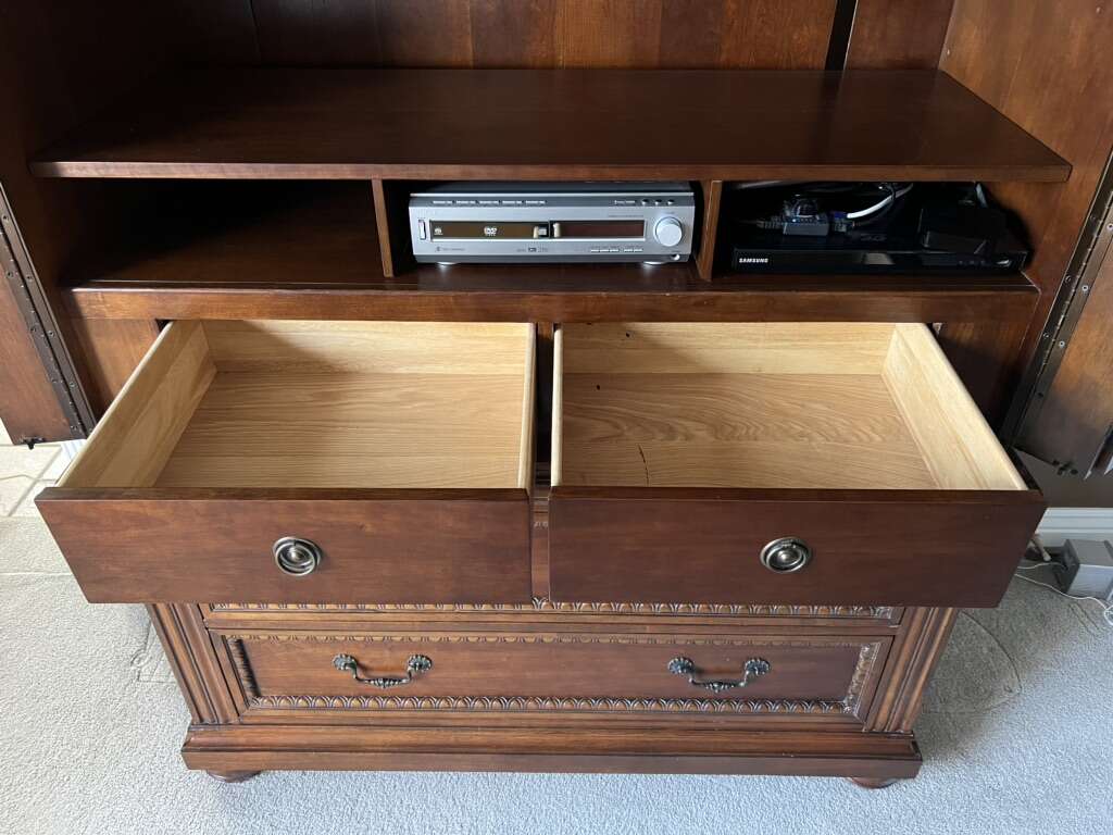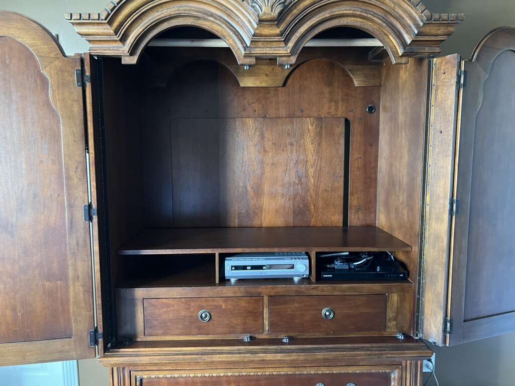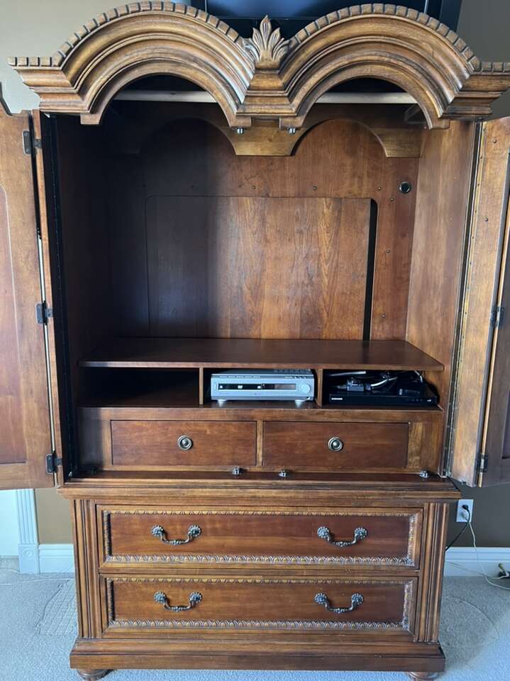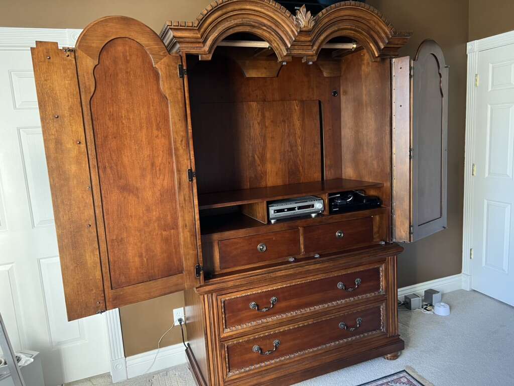 Beautiful high quality solid wood armoire with lower dresser drawers. The decorative trim and craftsmanship is amazing. No lightweight wood or particle board. There are two removable closet rods, three shelf-compartments, two internal drawers, and two large external drawers. If you’re looking for lightweight cheap furniture, this is not it. This is a two piece unit (easier to carry and transport). The top 56” piece will separate from the bottom 29” piece. Total dimensions are 85” tall x 54.5” wide x 24” deep.