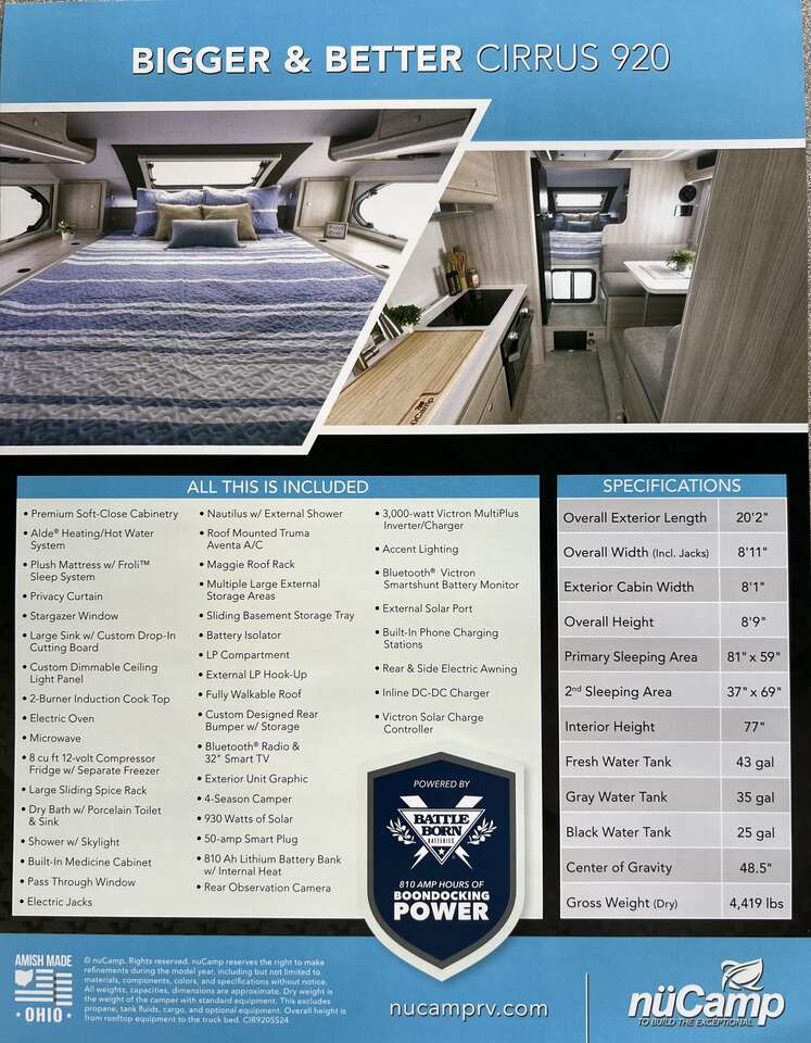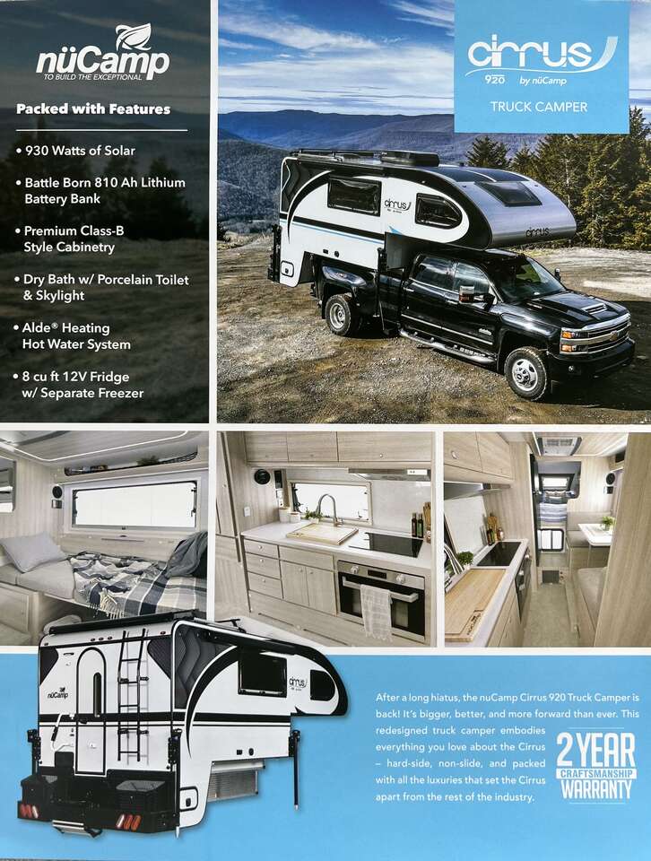 Introducing the 2024 Nucamp Cirrus 920! Perfect for long bed 1-ton truck owners. This redesigned truck camper embodies everything you love about the Cirrus – hard-side, non-slide, and packed with all the luxuries that set the Cirrus apart from the rest of the industry.