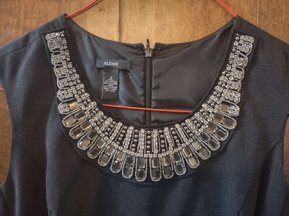 Ladies you are welcome to try it on. It's great for a night out, a wedding, or anything dressy. No need for a necklace with the embellished neck line.