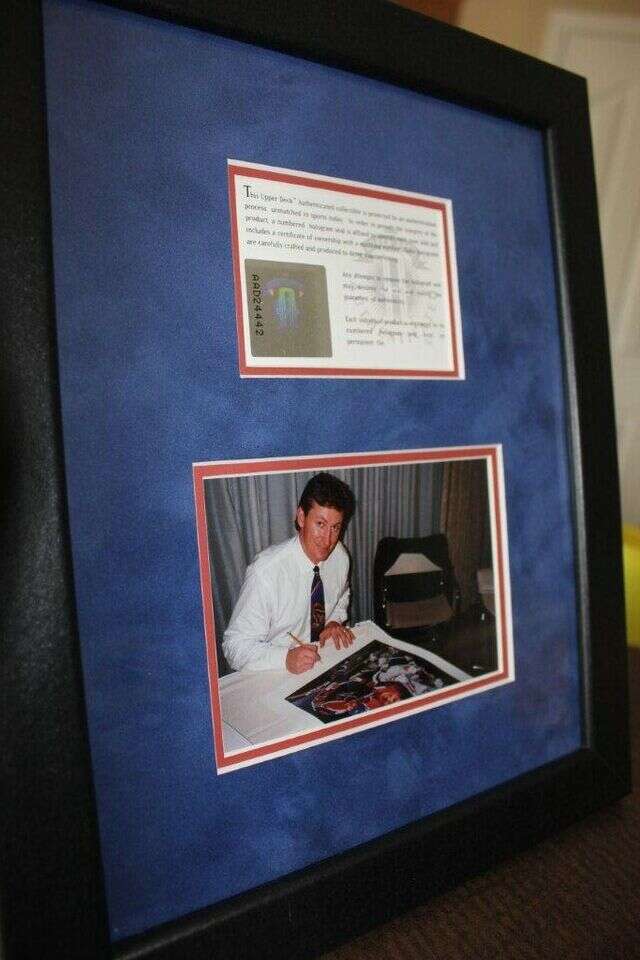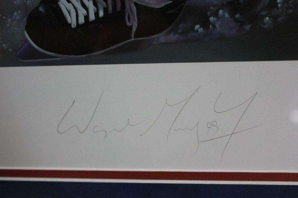PayPalPresented is a limited edition lithograph of Wayne Gretzky by artist Danny Day. The lithograph image (19" x 26") is professionaly framed, was signed by Gretzky and Danny Day at the bottom in pencil. It is numbered out of 880. It includes an UDA COA and a photo of Wayne signing the lithograph.