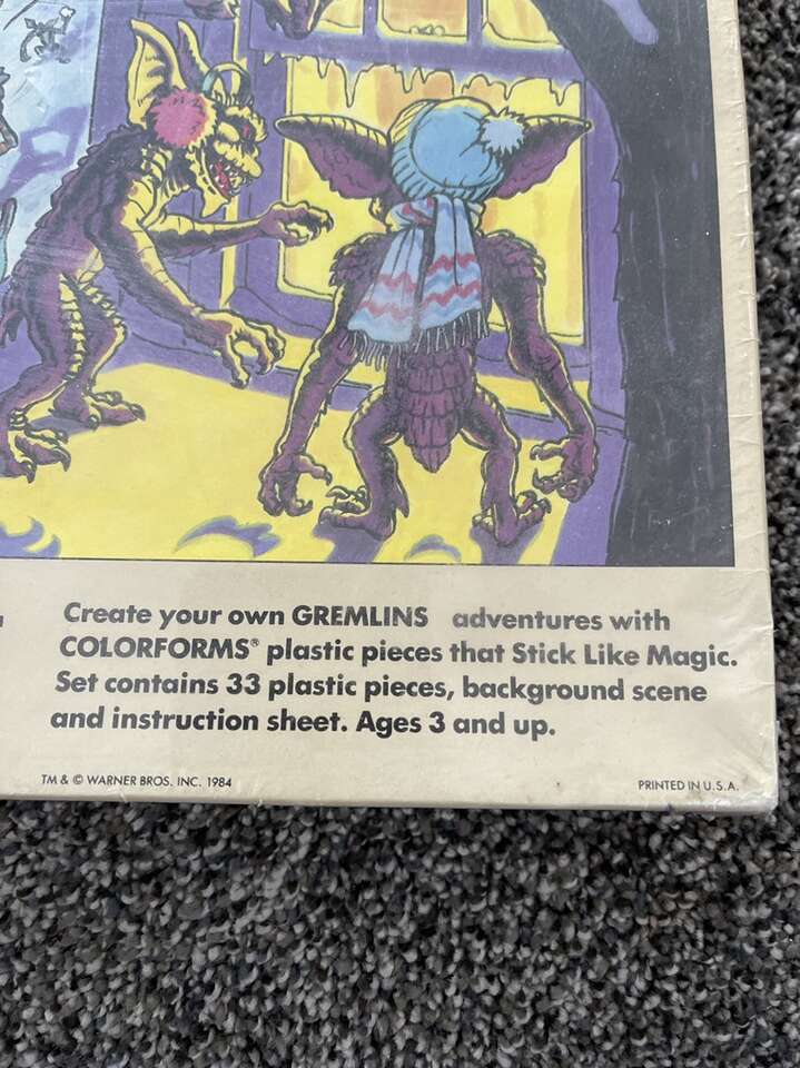 Gremlins play set is in sealed original plastic packaging. Has 33 plastic pieces that stick like magic to background scene. TM & Warner Bros. Inc 1984. Great retro game playing for your imagination! $259.99 to $99.00 on eBay.