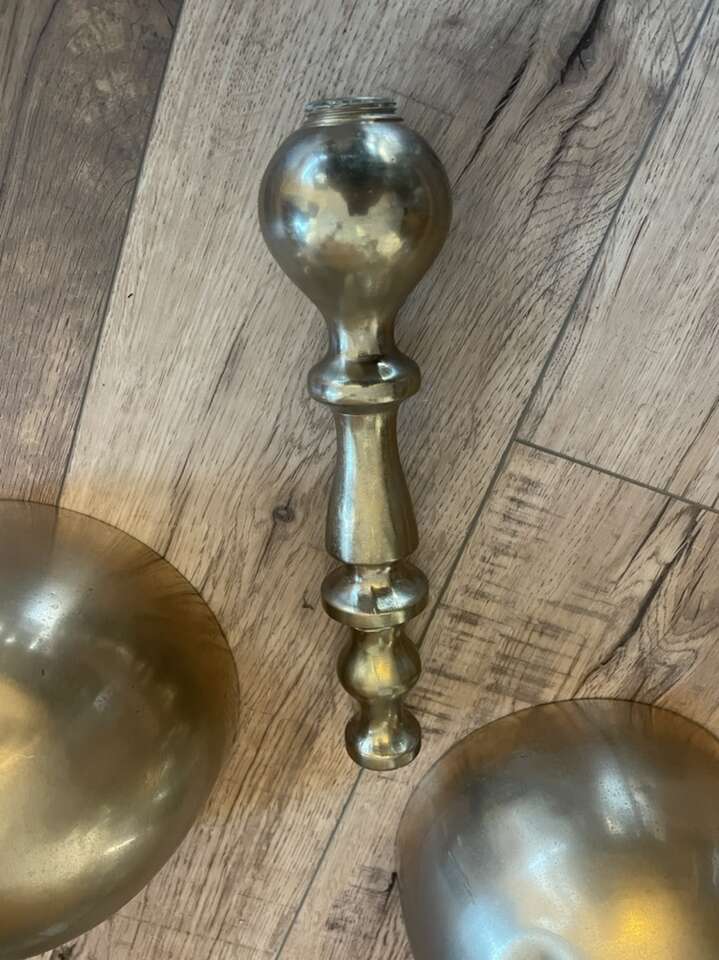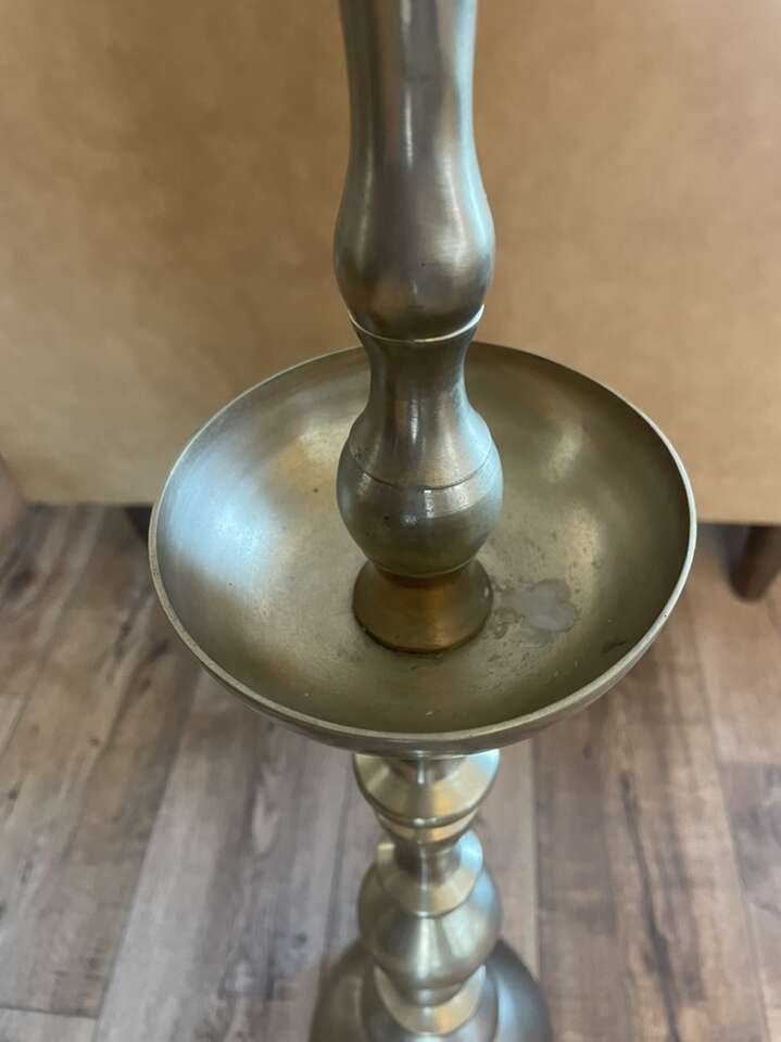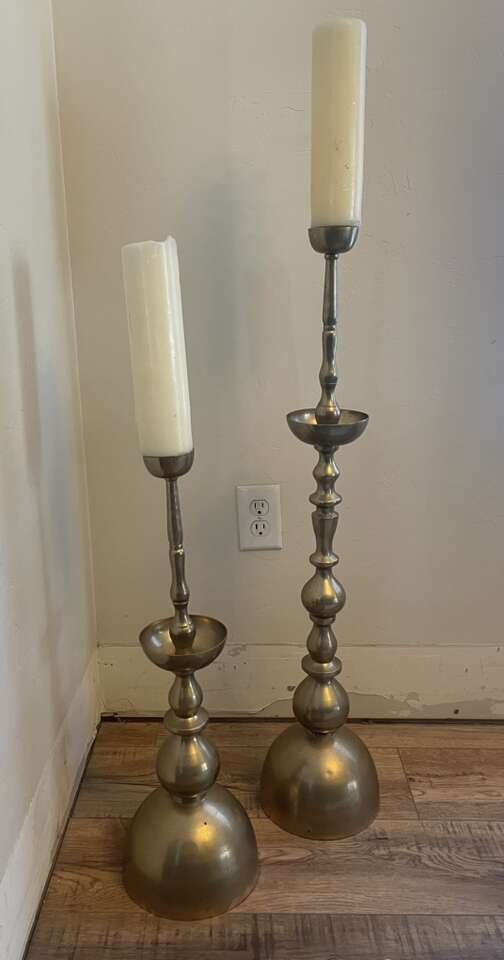 Incredible set of vintage brass candlesticks, they can be adjusted to stagger or left as full pieces. Amazing patina . 37” tall 8” at base at shorter length they are 28” tall