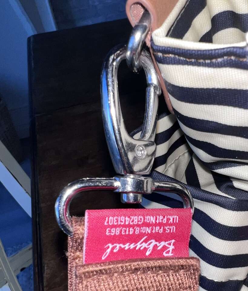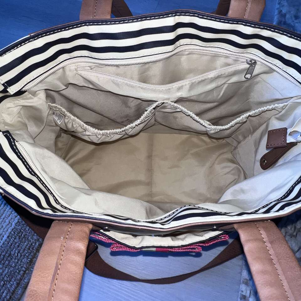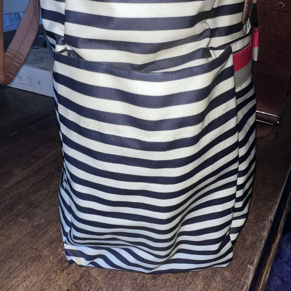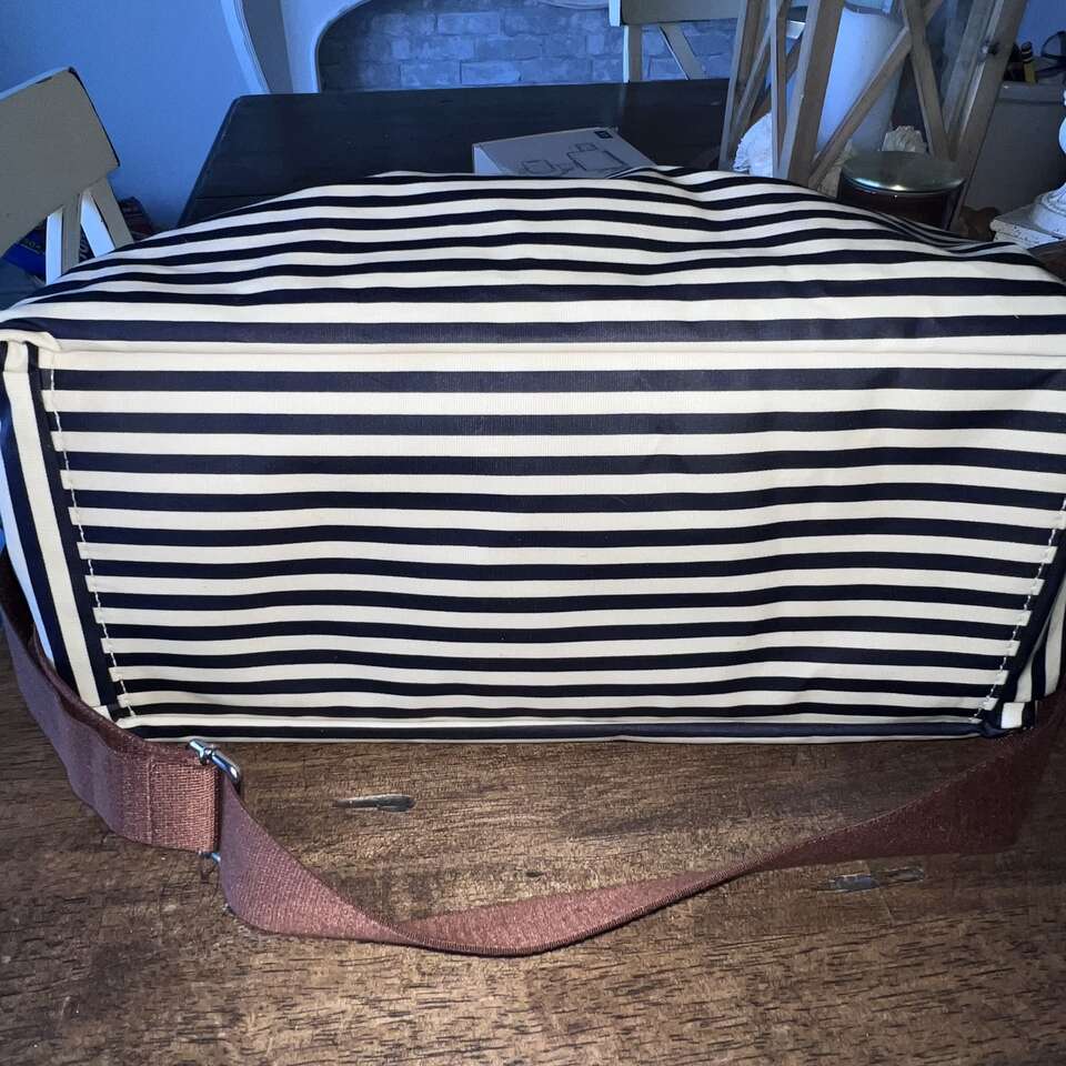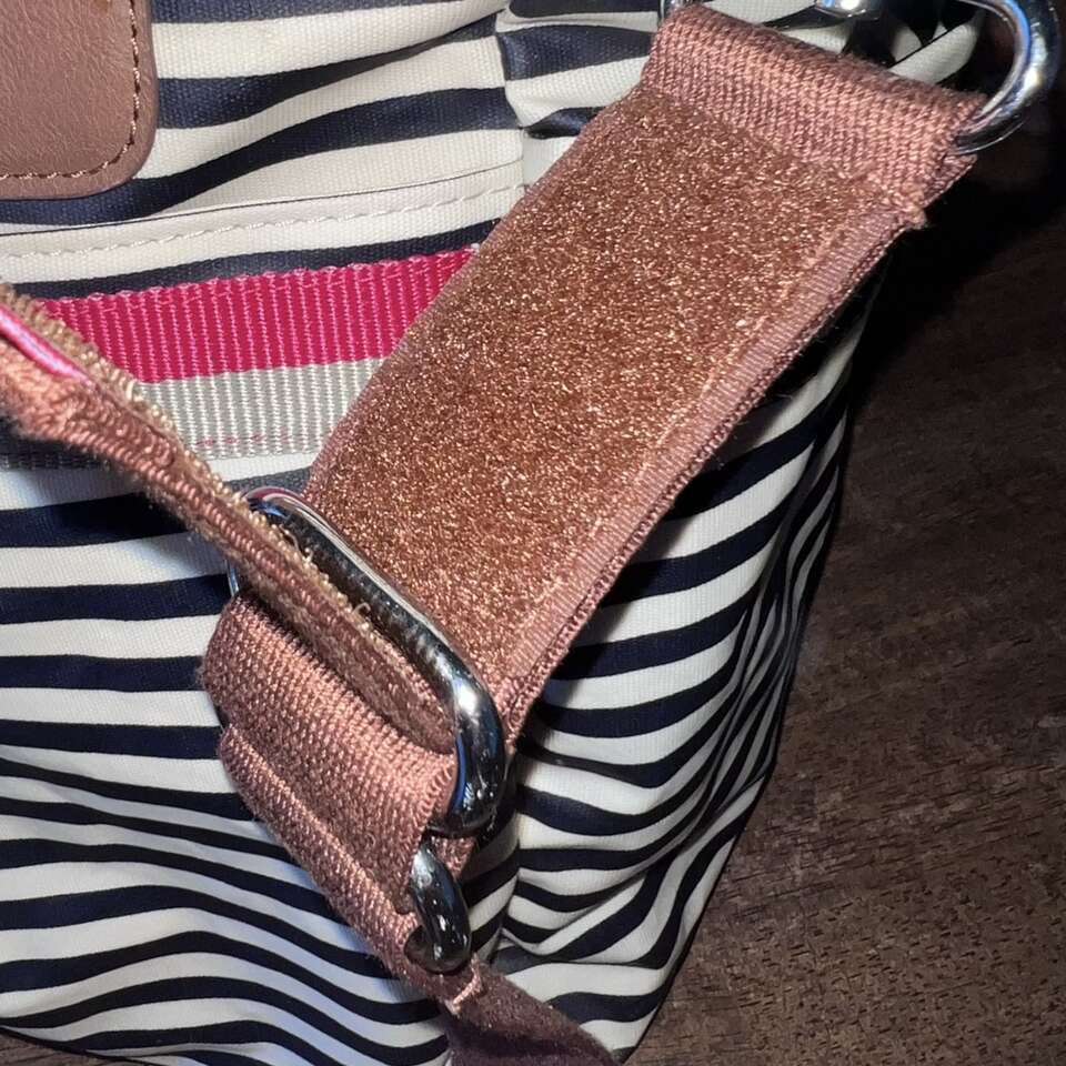 Navy stripe with faux brown leather handles and accents Water resistant laminated coated cotton canvas Detachable and adjustable shoulder strap Patented integrated stroller straps with strong velco fasteners - integrated on shoulder strap Exterior pockets; two spacious side pockets and spacious exterior front pocket with magnetic snap closure Interior pockets: 1 zippered pocket and 2 slip pockets with elasticized tops Machine washable padded changing pad - fold and fasten with velcro strap Large interior compartment with secure zipper top closure - Zipper is high quality! Easy wipe clean exterior and interior 12.5 H 18 L 6 D