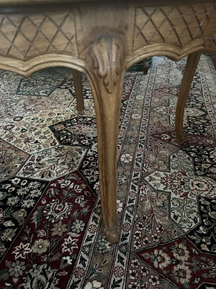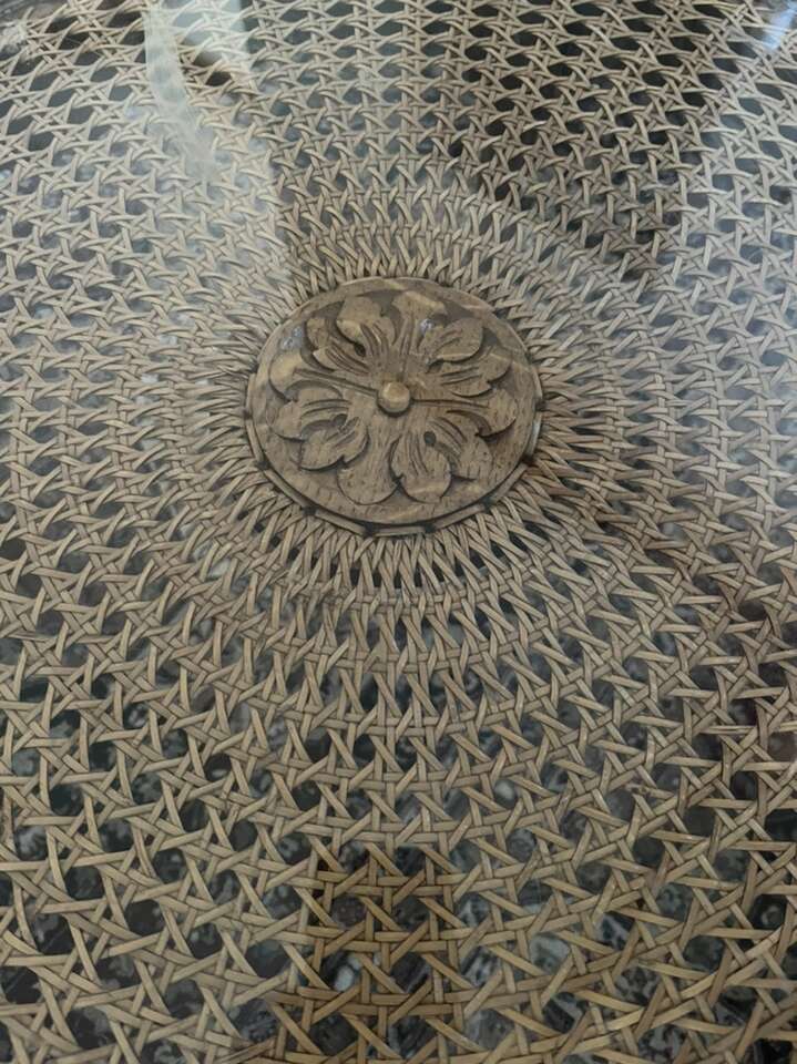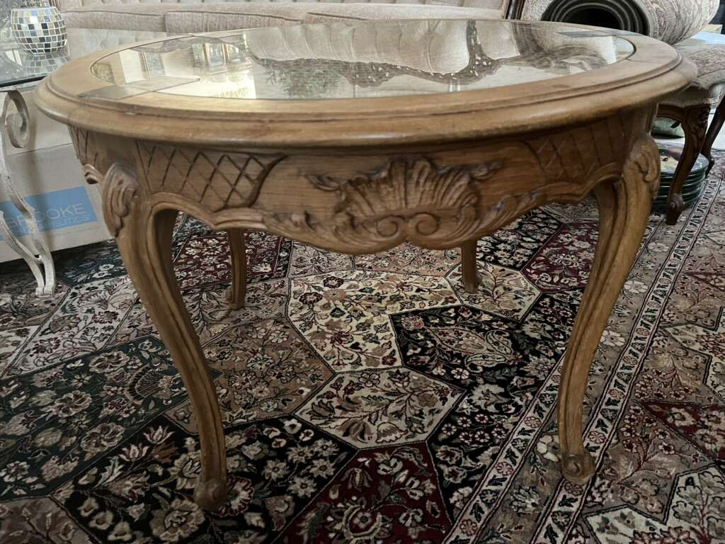This is a delicate, beautiful, antique, lighter wood, round table with glass center. Well cared for 27” across. 19” tall