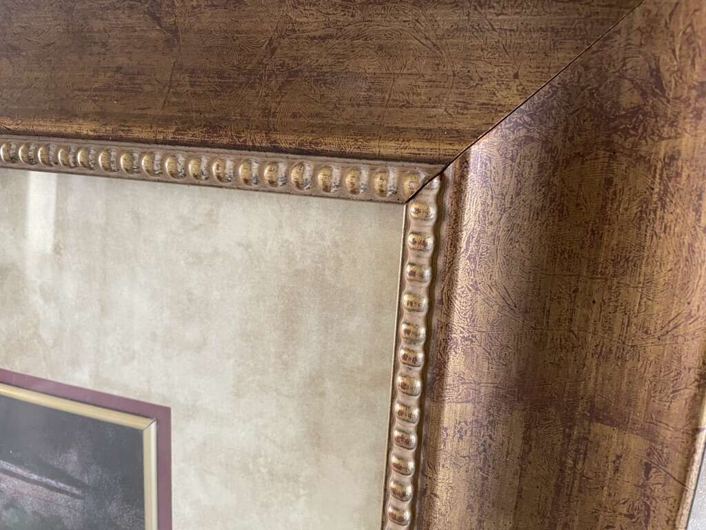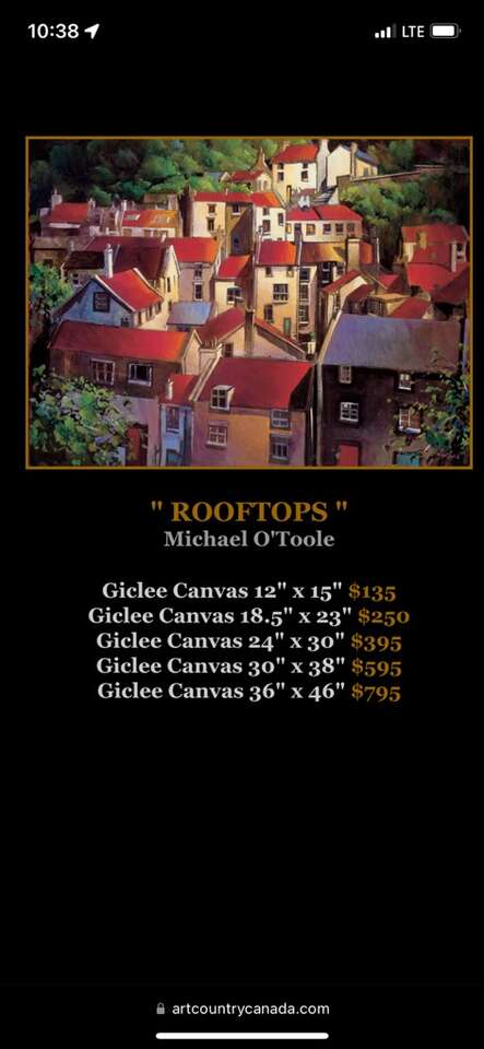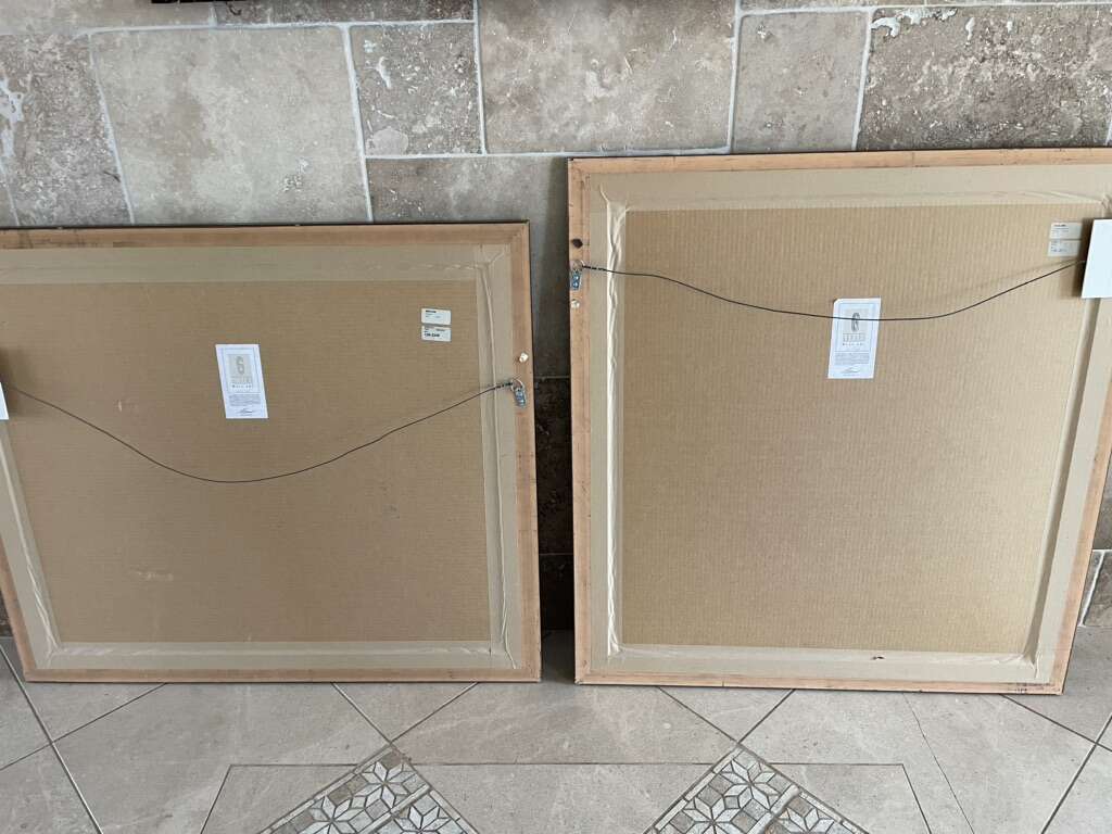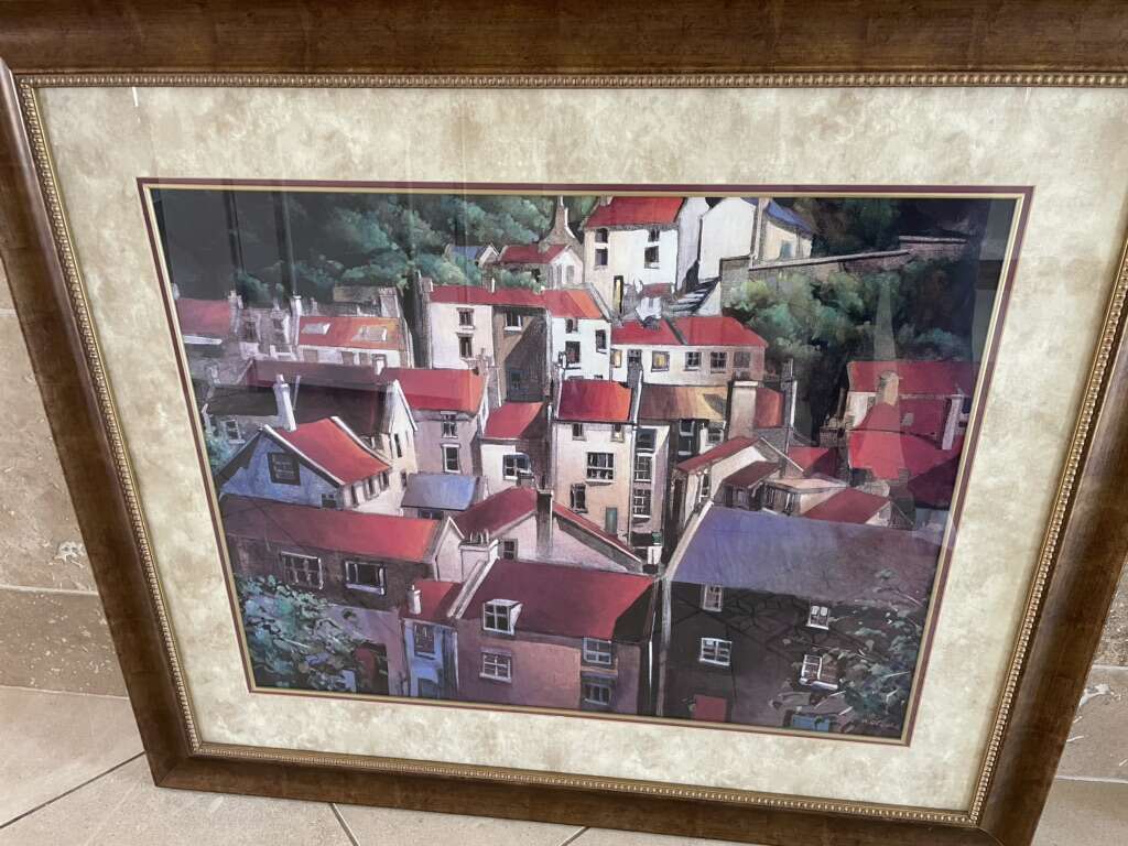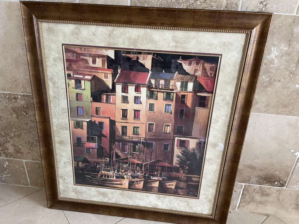 I have 2 really large pieces of art by Michael O’Toole. The one on the left is called Rooftops and the one on the right is Mediterranean Gold. They are in dark gold frames with black edges. They have picture wire on the backs for hanging. It’s hard to see how big they are in the pictures. The frame on Rooftops is 42 1/4 inches wide and 36 1/2 inches tall. The frame on Mediterranean Gold is 37 inches wide and 40 1/2 inches tall. 2 corners of the Rooftop frame have been chipped (see the closeup picture) but aren’t super noticeable. I assume they are prints but haven’t taken apart the frames to see. 2 pictures are current online prices of unframed prints of these 2 pieces. The price is for both pieces together but I can split them up if you just want one. The last 5 pictures are other artwork that I have listed on KSL. See my other ads for jewelry, artwork, home decor and more.