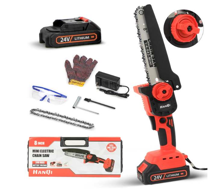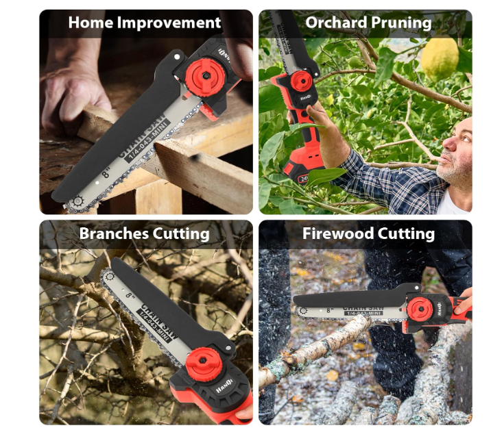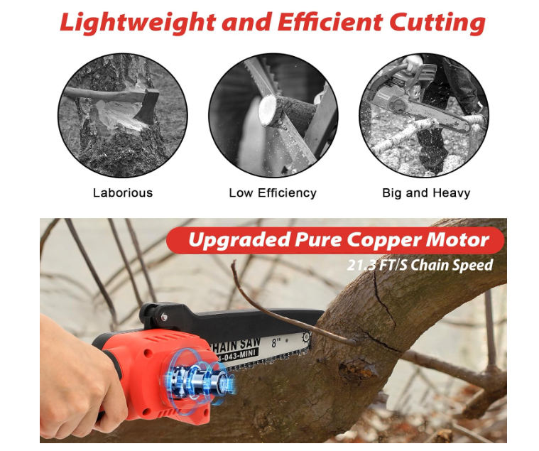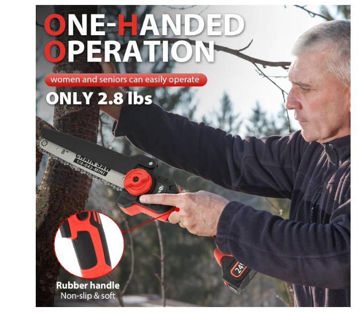 One-handed Operation & PortabilityThe mini chainsaw weighs less than 3 pounds and the compact design provides users with better control and maneuverability in tight access areas; the soft and non-slip rubber handle helps to operate the chainsaw easily for long periods of time, making it ideal for women and seniors