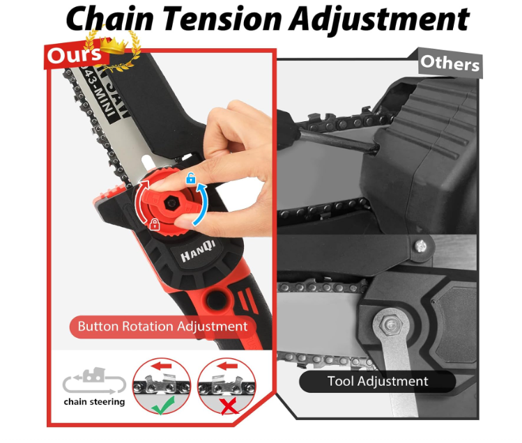 Tool-free Chain TensionerSmall chainsaw is fully assembled and ready to use after charging; this cordless chainsaw features a tool-free design that allows you to adjust the chain tension without tools, and comes with a detailed English manual for easy installation and chain replacement.