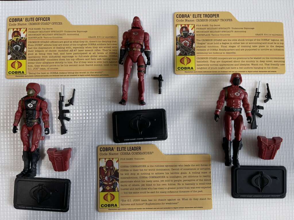 GI Joe 25th anniversary Toys R Us exclusive senior ranking officers Crimson Guard set. Contains Crimson Cobra Commander, Crimson Guard Officer and Crimson Guard trooper