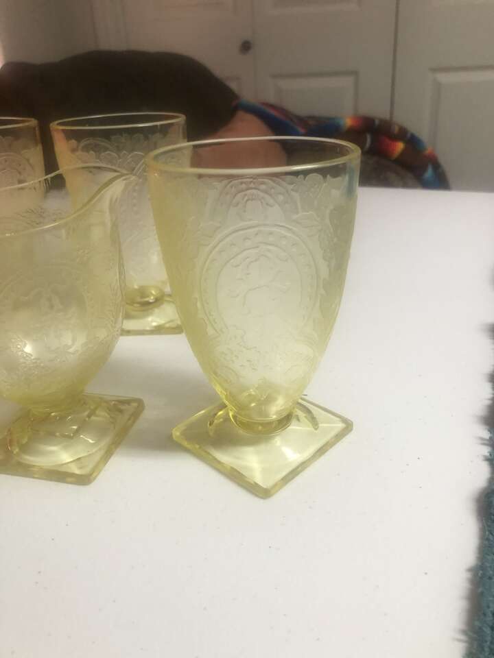 PayPalHorseshoe pattern in yellow. Cream, sugar and 4 tumblers. In excellent condition, no chips no chiggers.Not a reproduction. This has been in my collection for 25 years. Priced from the depression glass book by Mauzy, copyright 1999. Cream $25, Sugar $25, Tumblers $40 each. $10 off for buying the set. I am just starting to thin out my very large depression glass collection.
