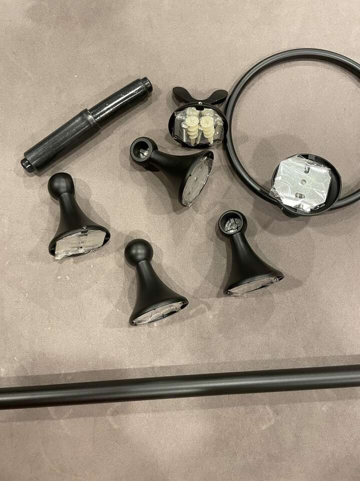 New Bathroom Hardware set matte black, 4-Pieces 24” towel bar, towel ring toilet paper holder and robe hook. I have 8 of these available. Price is for each