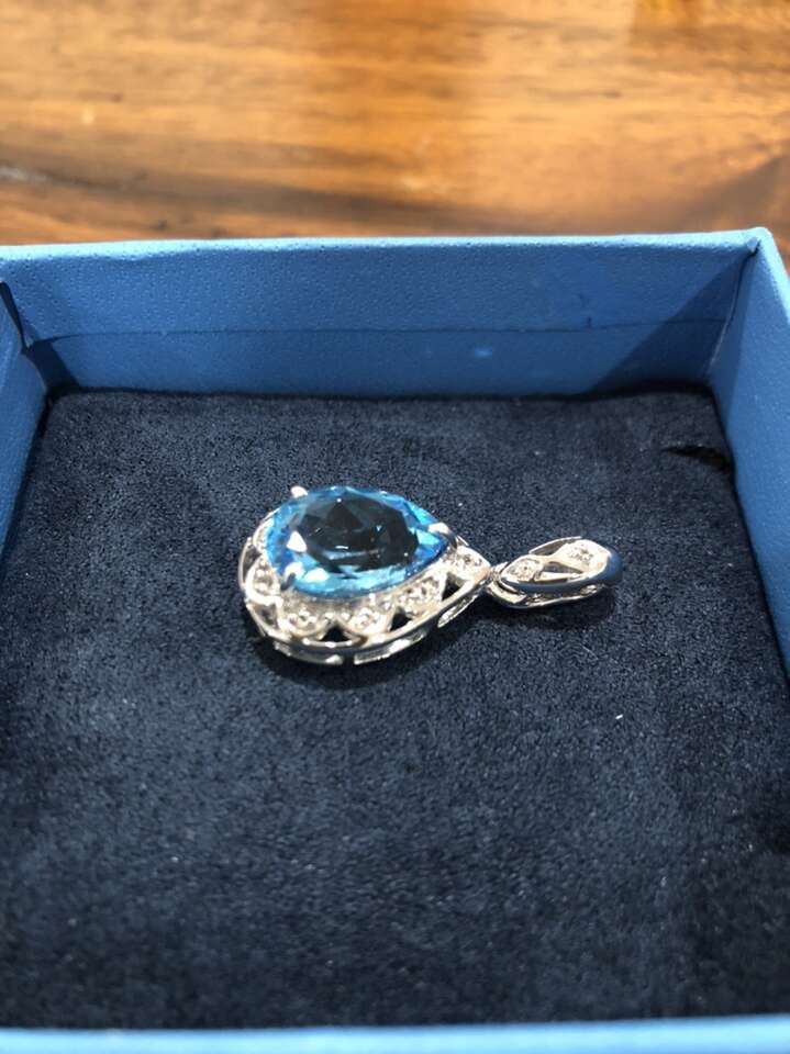 Beautiful 1.25 inch sterling silver drop pendant with 6.64 ctw Swiss blue topaz gemstone. New in box. Coordinating sterling silver chains also available.