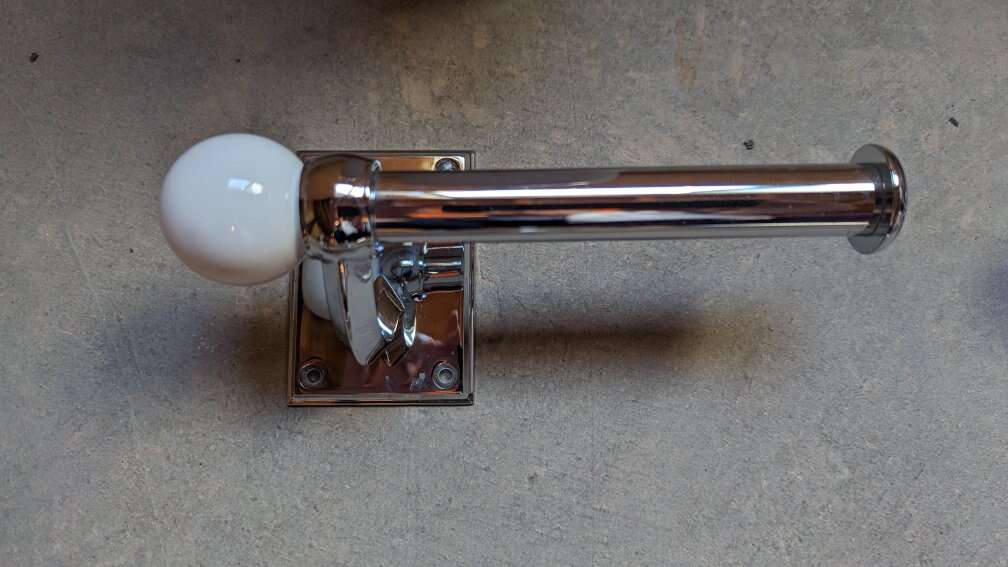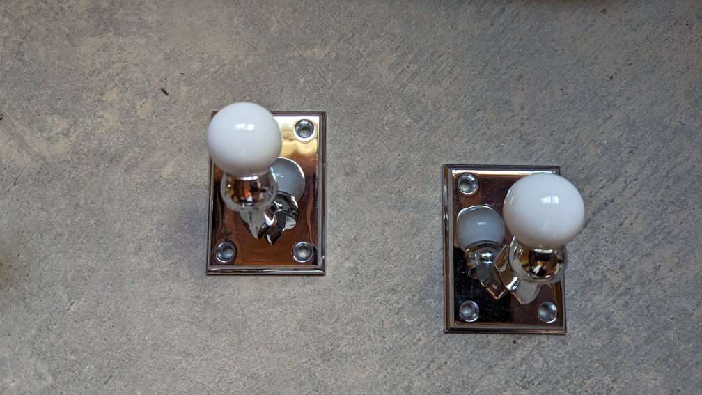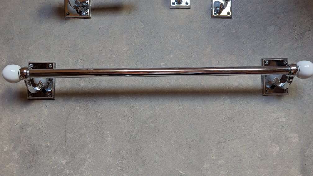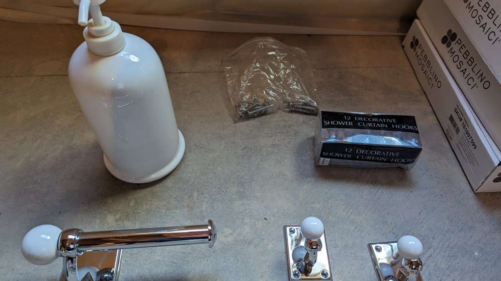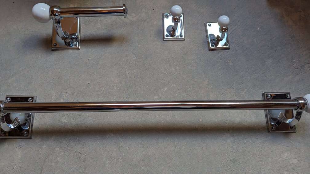 One 25 inch towel bar. One toilet paper holder. Two robe hooks. A large white soap or shampoo bottle. I have the wall screws that come with the set. Chrome with a white ball on the end, unique design. Pictures make them look discolored, they are not, chrome is shiny and looks great. Great condition. Unique bathroom set. No scammers.