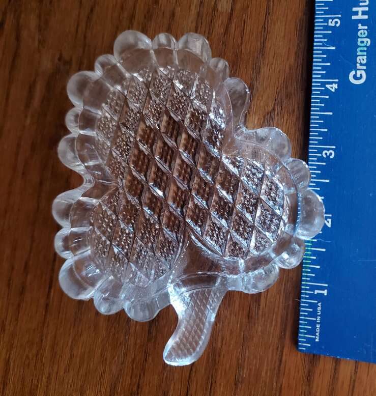 Vintage Pressed Glass Nut dish Clover or Club Shaped Scalloped Edge 4” x 5” x 3/4” Some tiny chips along edge.