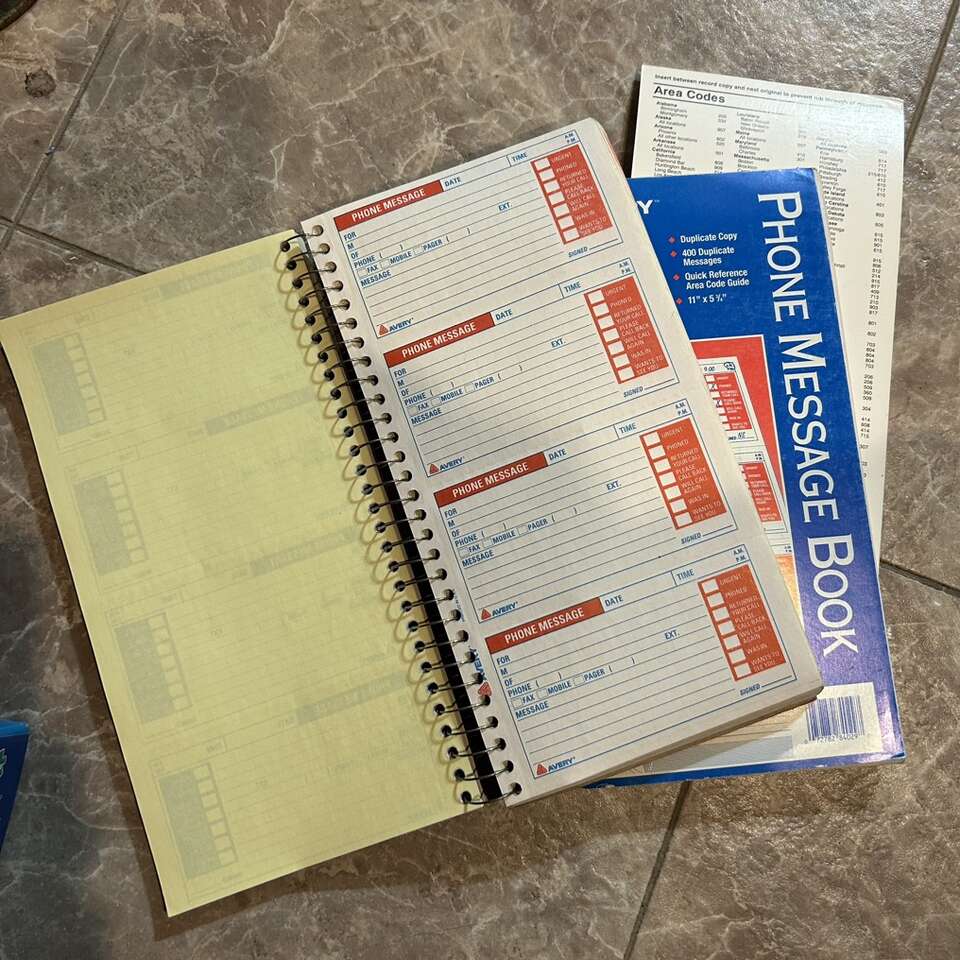 Two Barely used (maybe 2 or 3 pages) Avery Phone Message Books with Duplicate Copy on yellow paper. Updated edition with Fax and Mobile phone boxes. 11” X 5 3/4”. One book had the card-stock (area code directory) insert to place between record copy and next original to prevent rub through of message. Delivery available to a convenient location when in your area for $5.