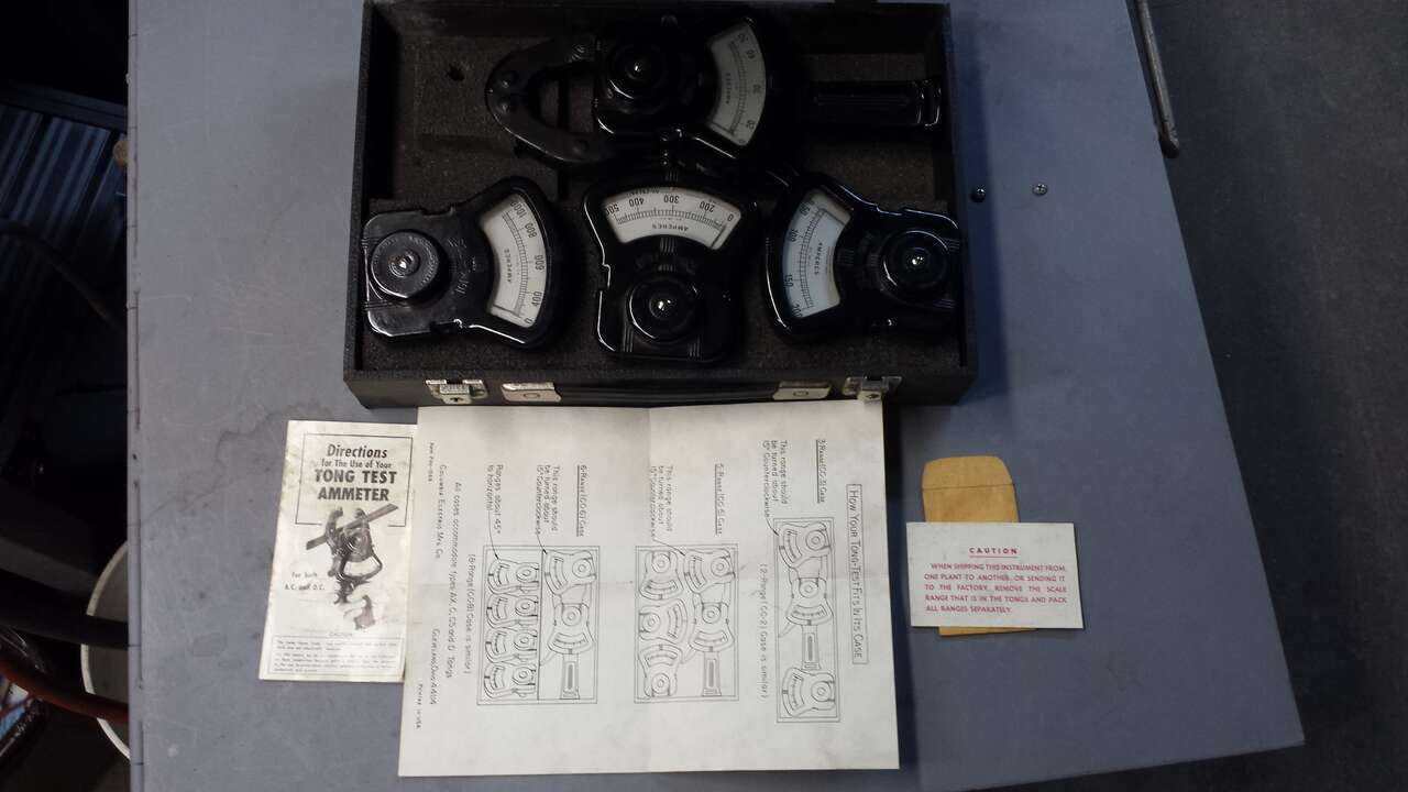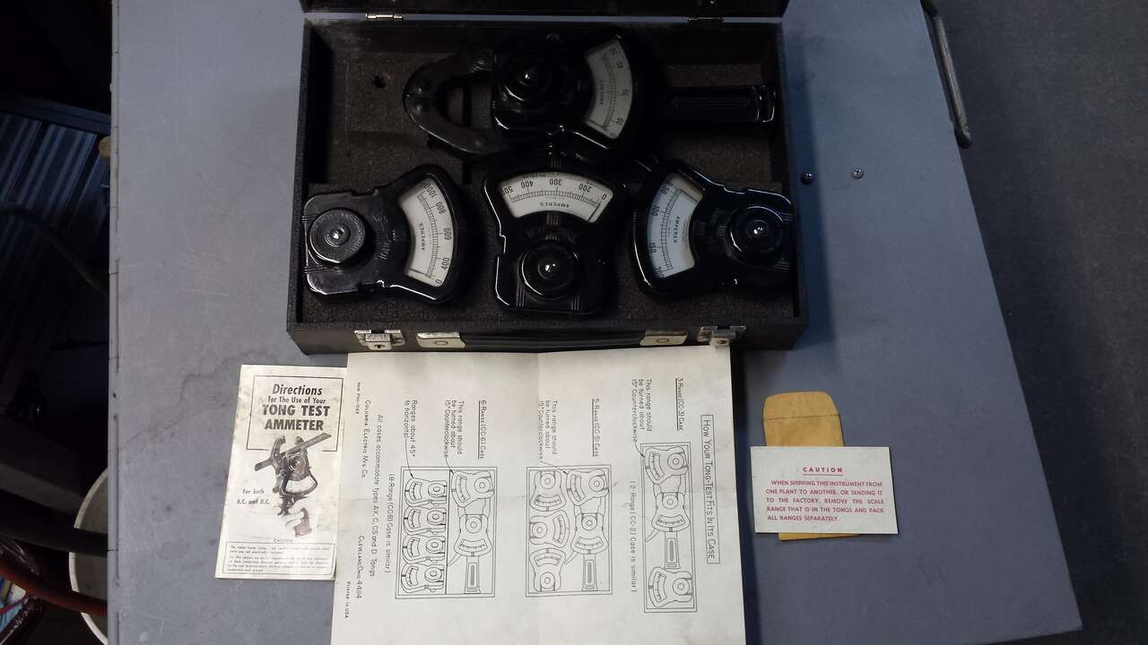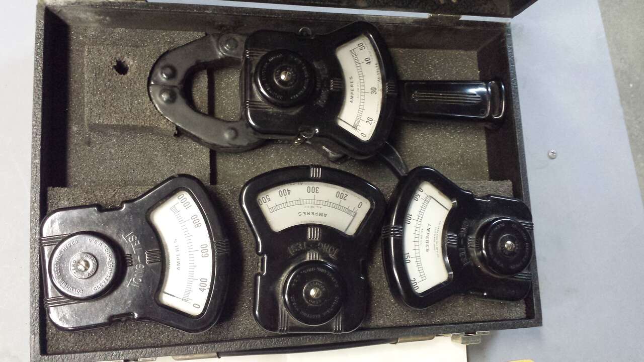 Columbia Electric MFG Co. vintage AC-DC amp clamp set. Four interchangeable meters, 0-50, 0-200, 0-500 and 0-1000. in original case and with original direction booklet.