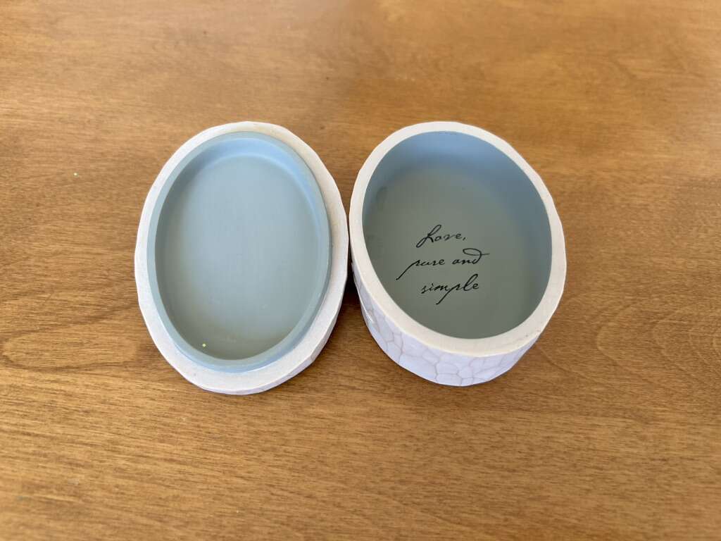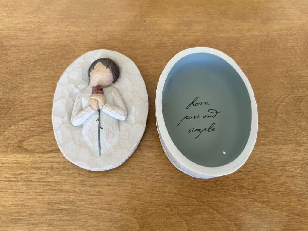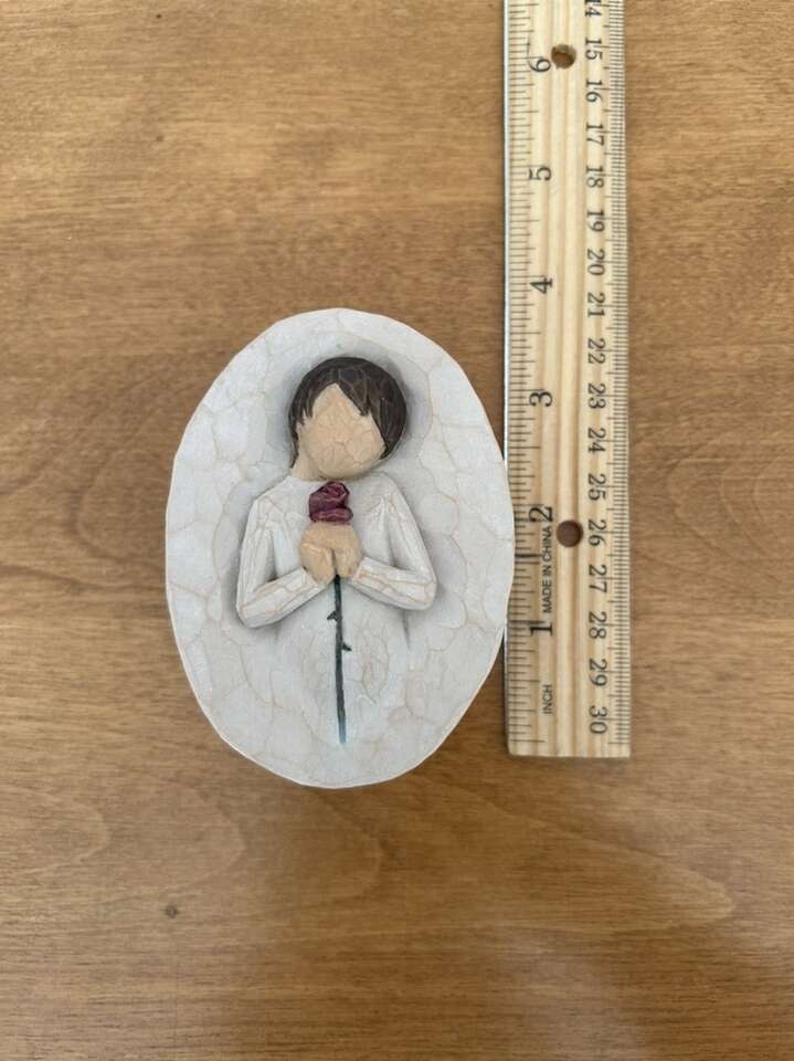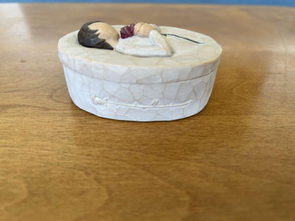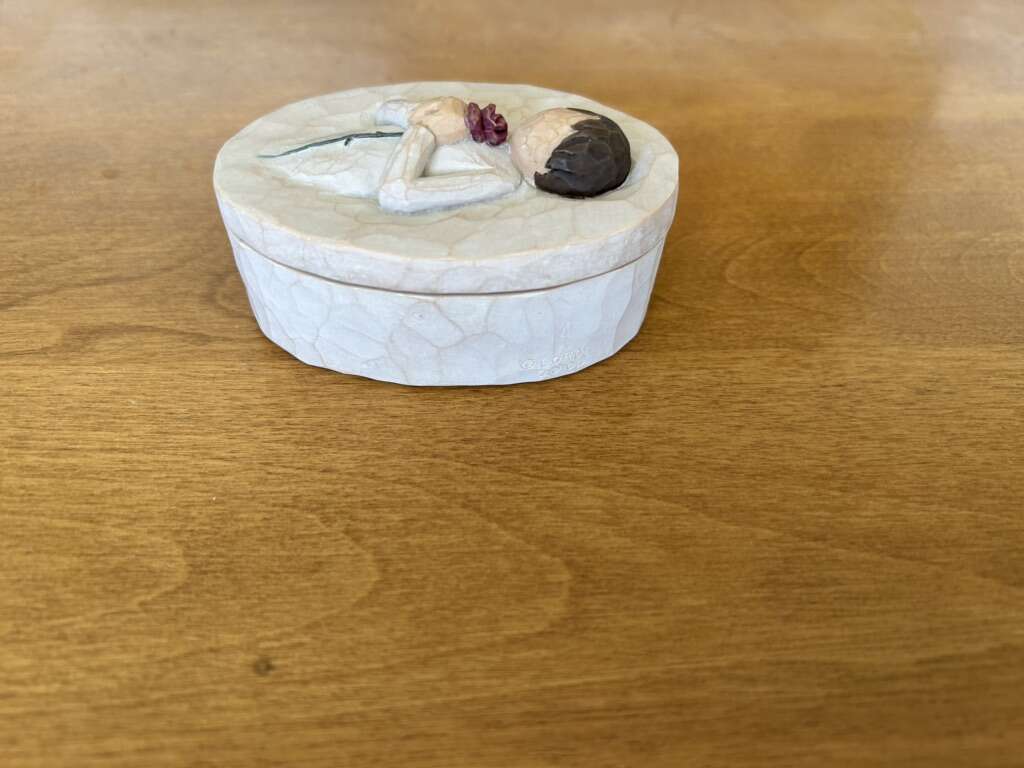 Willow Tree “Loving Angel” DEMDACO Collectible Oval Box, by Susan Lordi, 2004. Beautiful keepsake oval box with angel holding a rose. On the inside it says, “Love, pure and simple.” Hand-painted resin, 3.5” x 2.5”. Excellent condition. Text only. Cash or Venmo.