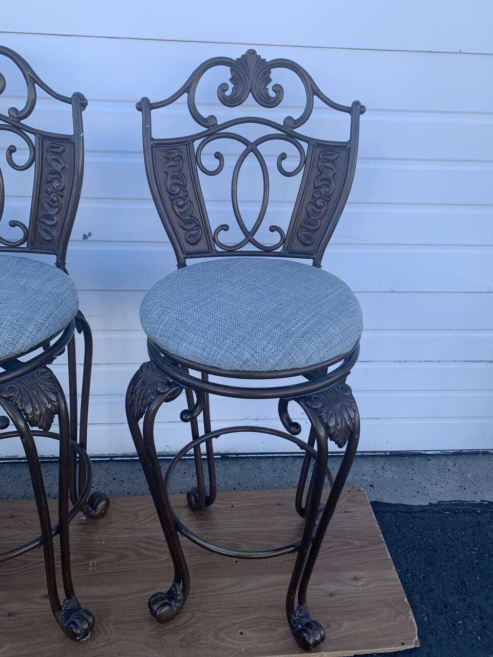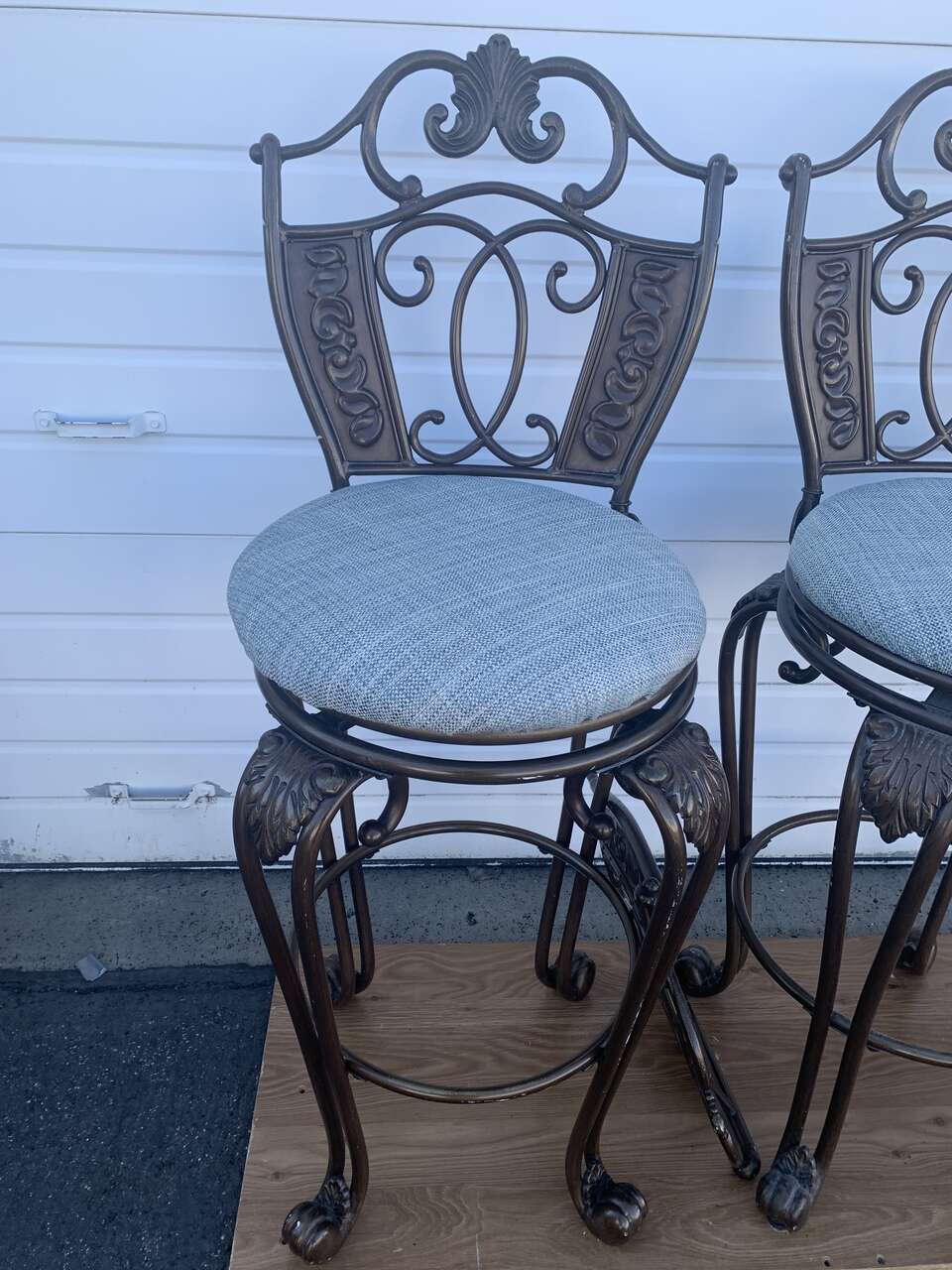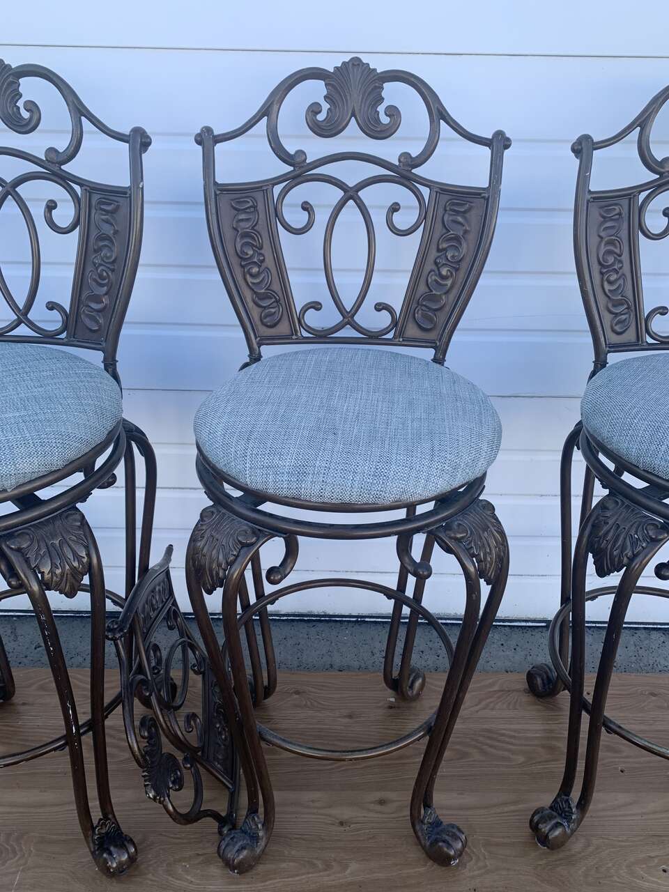 4 Bar Height Swivel Stools. Used condition. Backrest can be removed. Measures 52 inches tall ( From the ground to the seat, it’s 33 inches tall ) × 18 inches wide. These are not the average bar stools, they’re heavy, sturdy and very elegant! Solid cast metal with a vintage bronze finish. Fabric color is blue-gray ish. Price is for FOUR swivel stools, I have the fourth one stored away but it’s the same condition as the other 3. Pick up and Cash only, please. FCFS. Located in Ogden