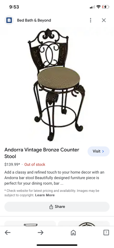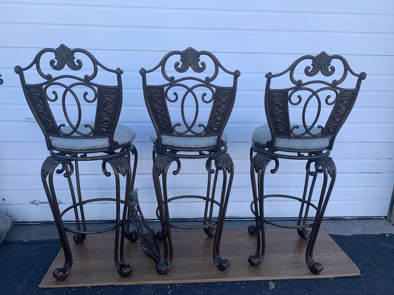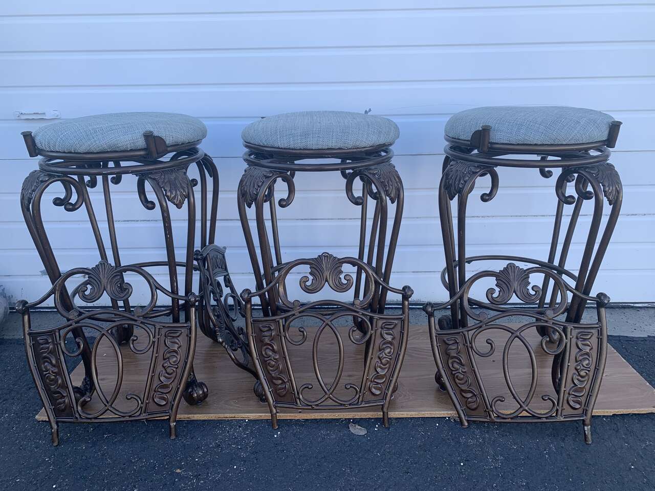 4 Bar Height Swivel Stools. Used condition. Backrest can be removed. Measures 52 inches tall ( From the ground to the seat, it’s 33 inches tall ) × 18 inches wide. These are not the average bar stools, they’re heavy, sturdy and very elegant! Solid cast metal with a vintage bronze finish. Fabric color is blue-gray ish. Price is for FOUR swivel stools, I have the fourth one stored away but it’s the same condition as the other 3. Pick up and Cash only, please. FCFS. Located in Ogden