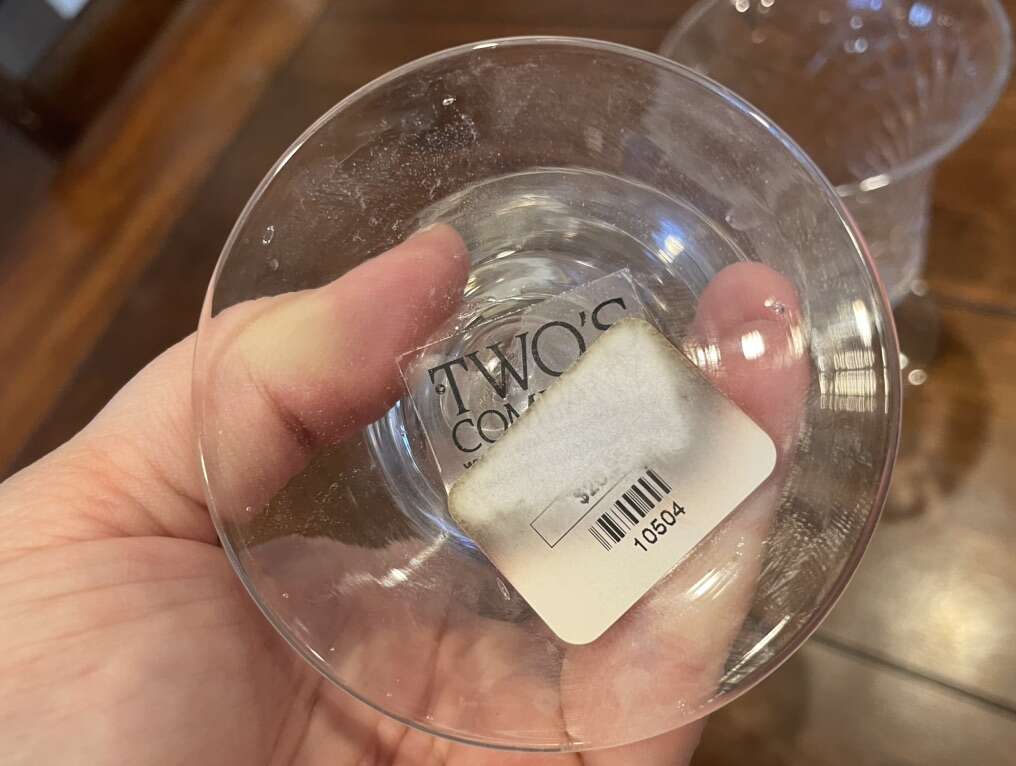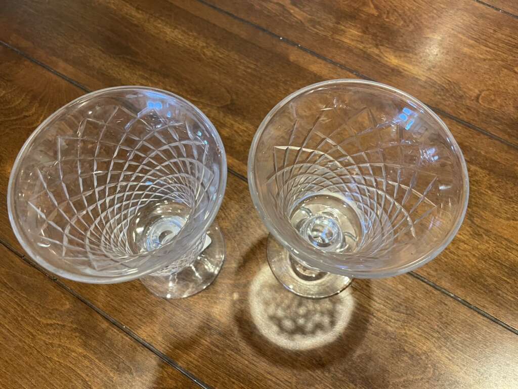I have 2 glasses or sundae dishes by Two’s company. They have a cut crisscross pattern. They are 5 3/4 inches tall. One still has the price tag on the bottom showing they were over $20 each. I’m asking just $4 for both of them together. See my other ads for jewelry, artwork, home decor and more.