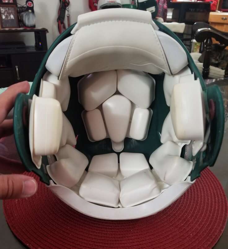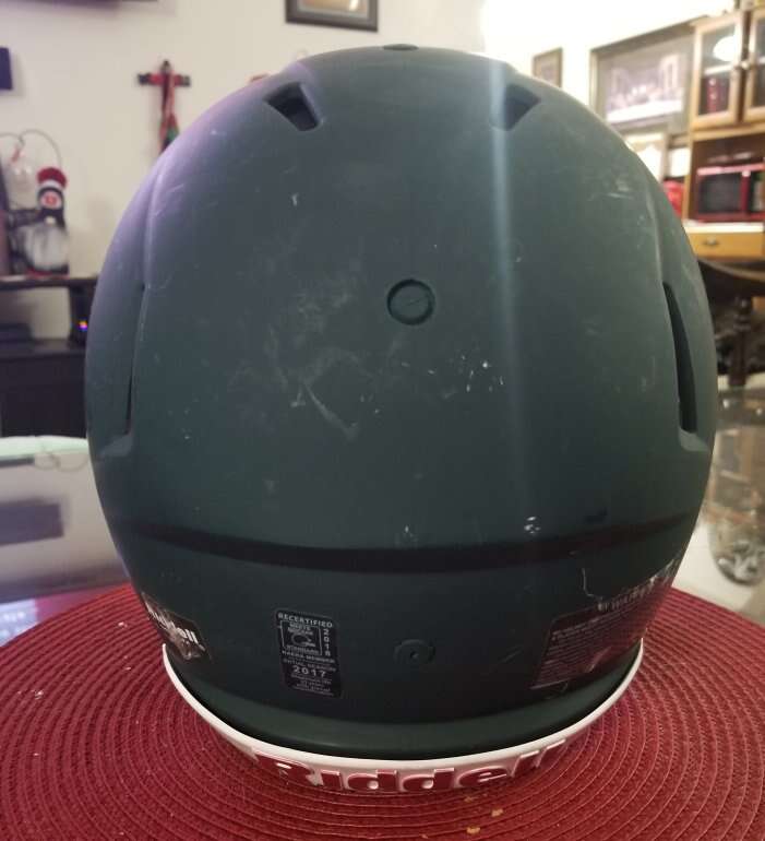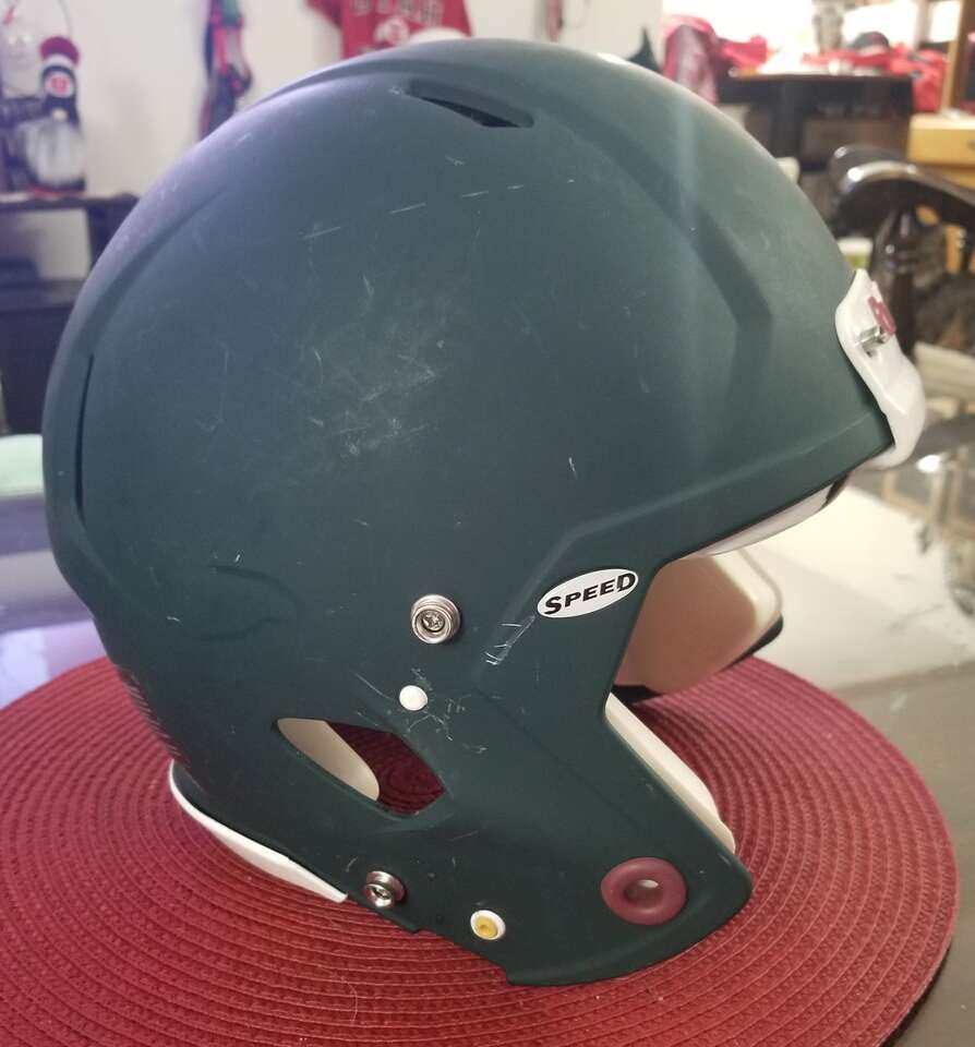 I have a flat green, Riddell Speed youth Med football helmet for sale. This helmet comes with white padding and no facemask or chin strap.