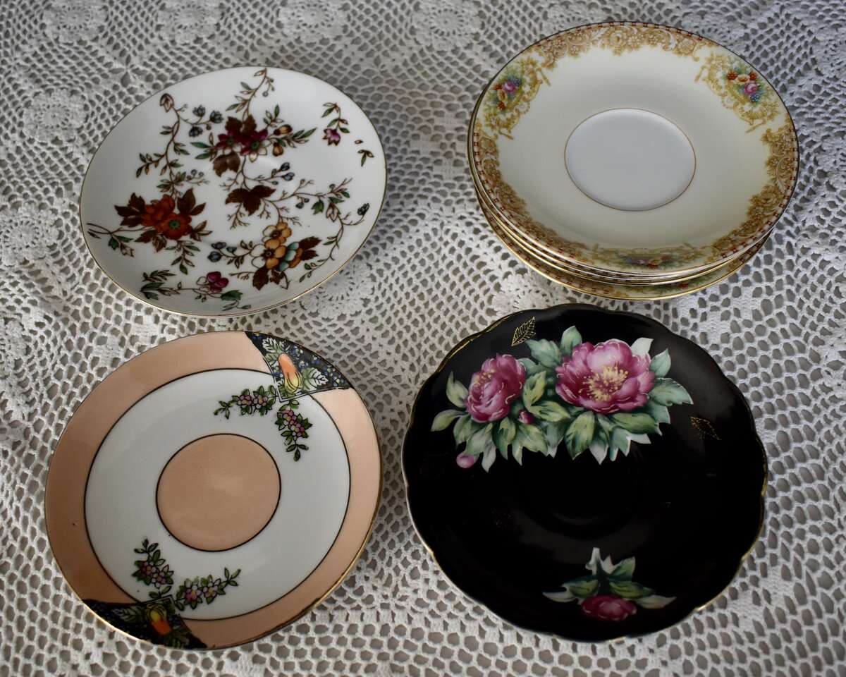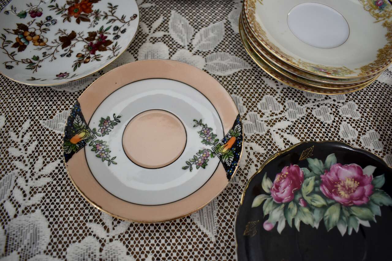 SEVERAL ASSORTED ANTIQUE SMALLER TEA CUP SIZE PLATES FOR TEA PARTIES IN DIFFERENT SIZES AND COLORS