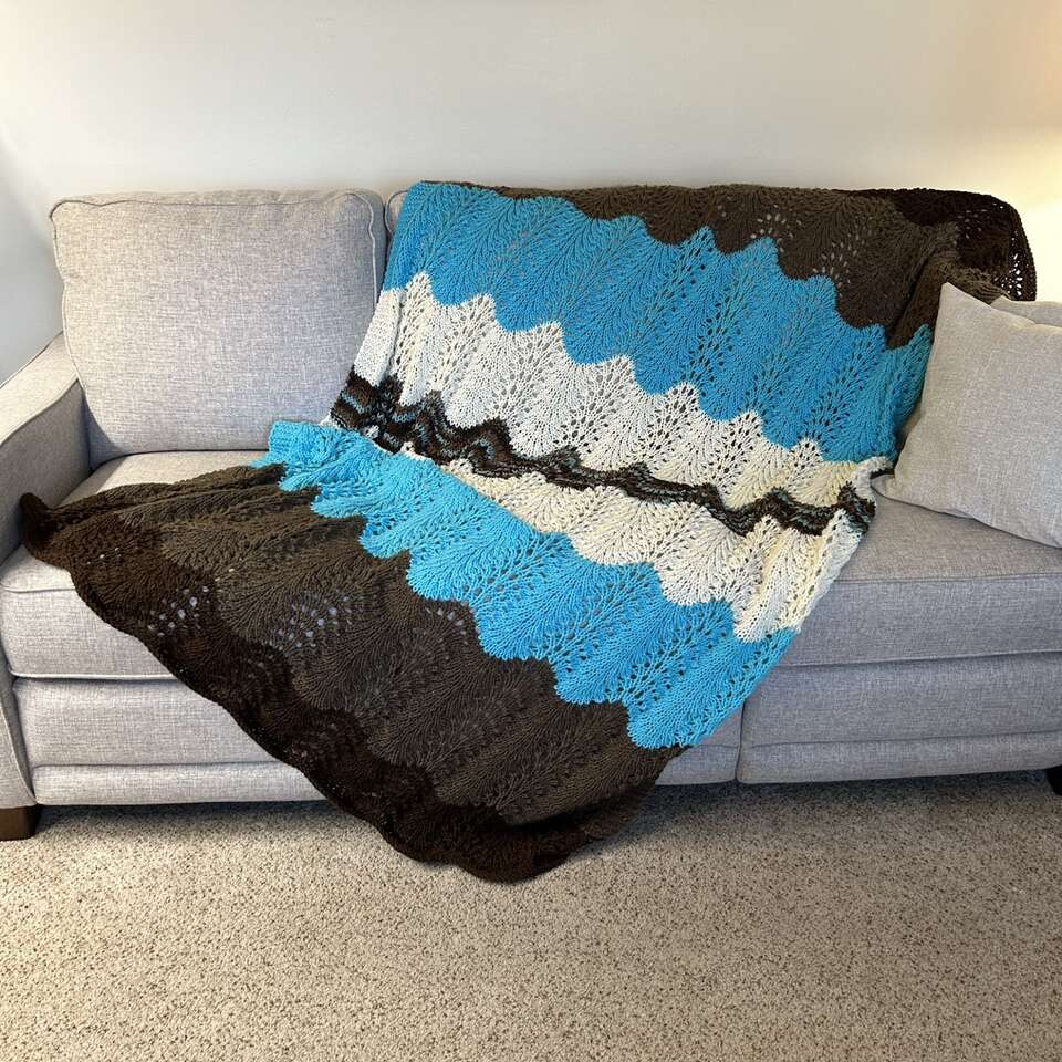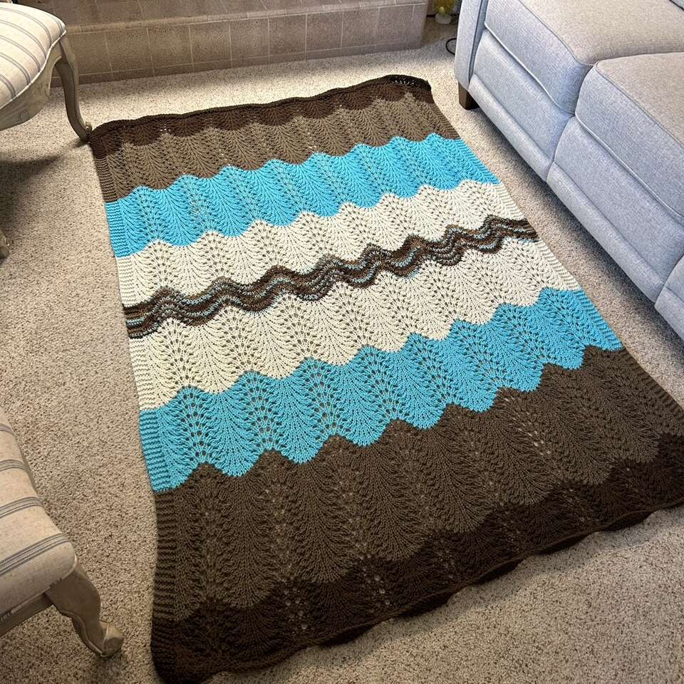 Cottagecore, Grannycore, Farmhouse, Grandmacore, Maximalism, Minimalism, Dorm Ready, College Student, Den, Couch, Sofa Throw, Armchair, Reading Lap Blanket, Throw, Afghan, Crochet, Knit, Handmade, Hand Crafted, Homemade, One-of-a-Kind, OOAK, Unique, Contemporary, Versatile, Colorful, Bright, Pastel, Pastel-goth, Wrap, Comforter, Bedspread, Bed Topper, striped, zigzag, blue, brown, beige,