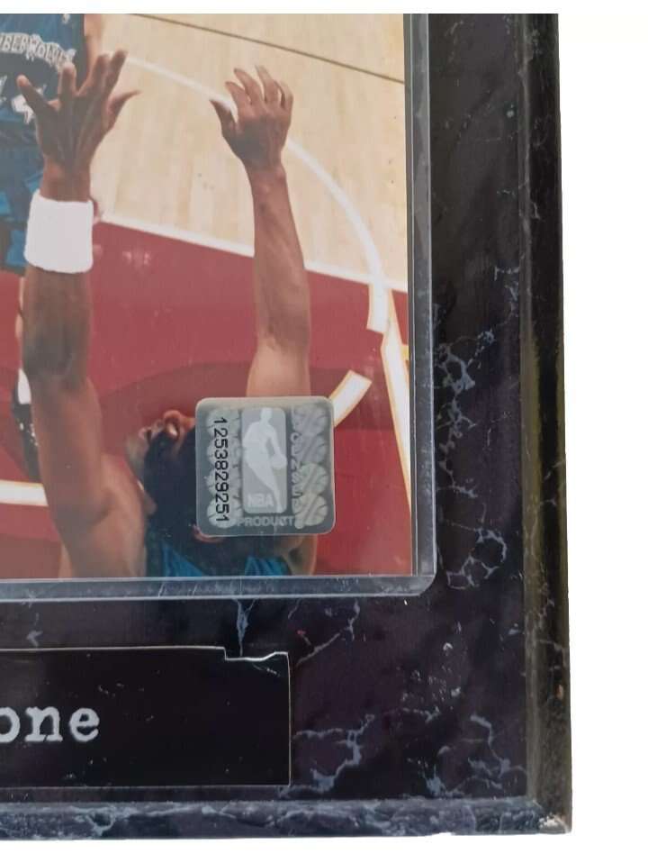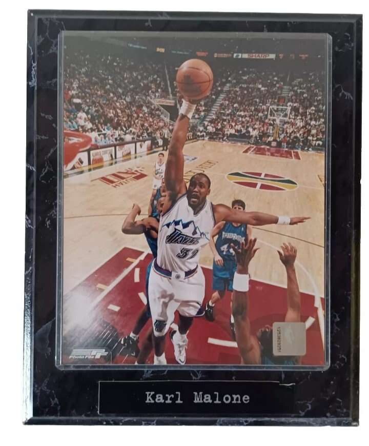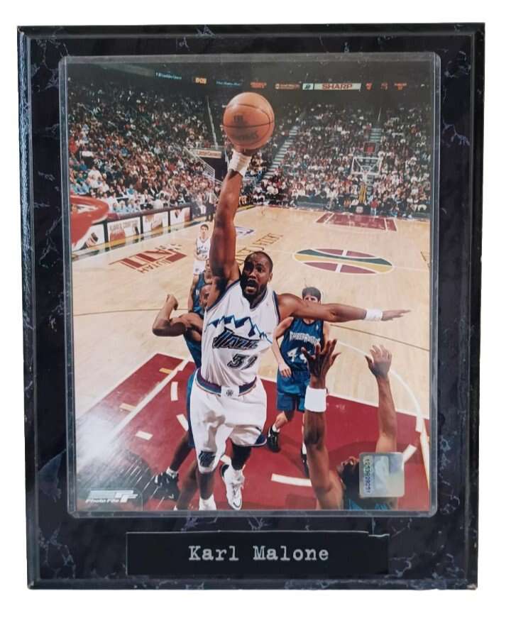 This is an authentic poster featuring two of the greatest basketball players of all time, Karl Malone and John Stockton. The poster measures 13 x 11 inches and showcases the players in action during a regular season NBA game. The black and white color scheme adds a classic touch to the overall design.