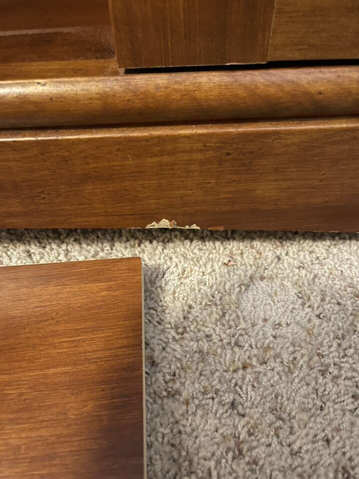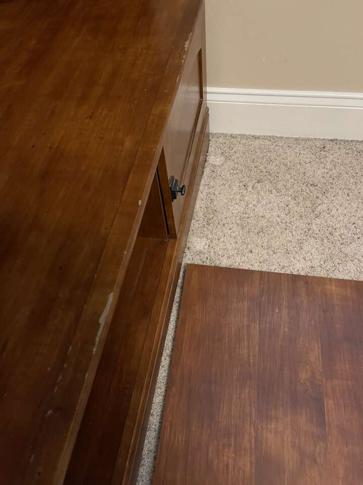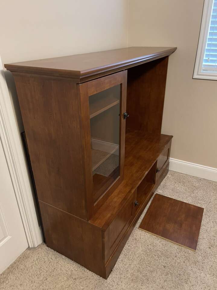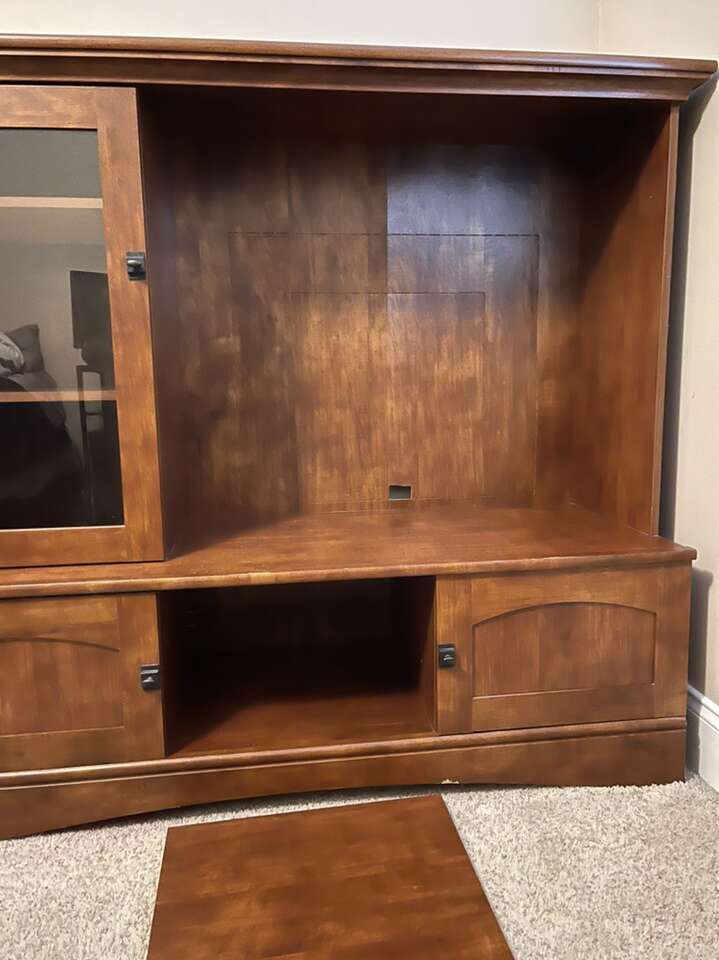 Entertainment center is in good condition with minimal page damage. At the largest points it measures 59.5 in wide x 21 in deep x 51.75 in tall. Feel free to call or text(preferred), if you have any question. If I don’t answer please leave a message and I will get back to you ASAP.