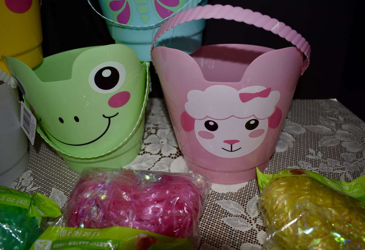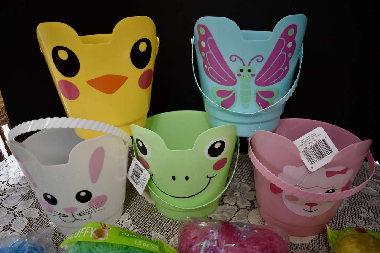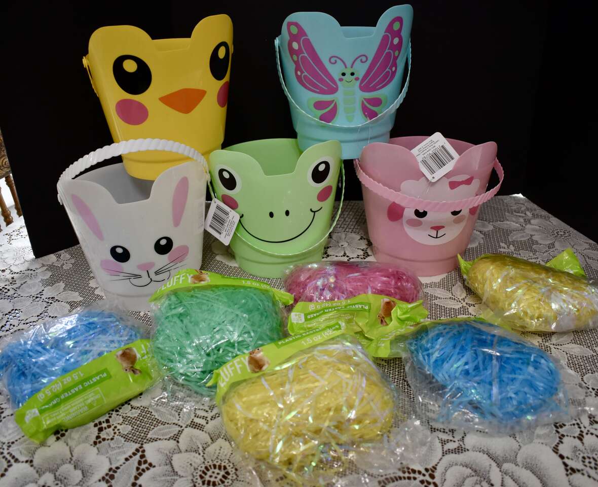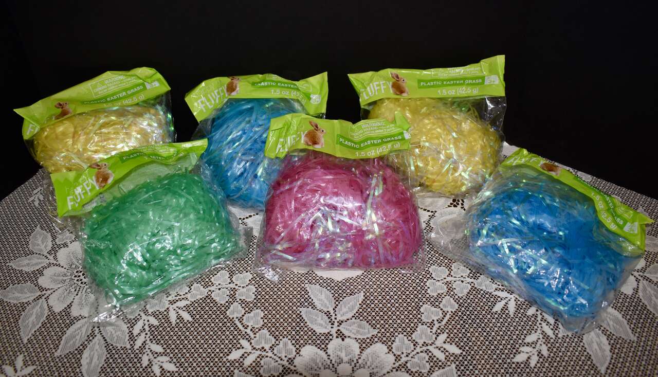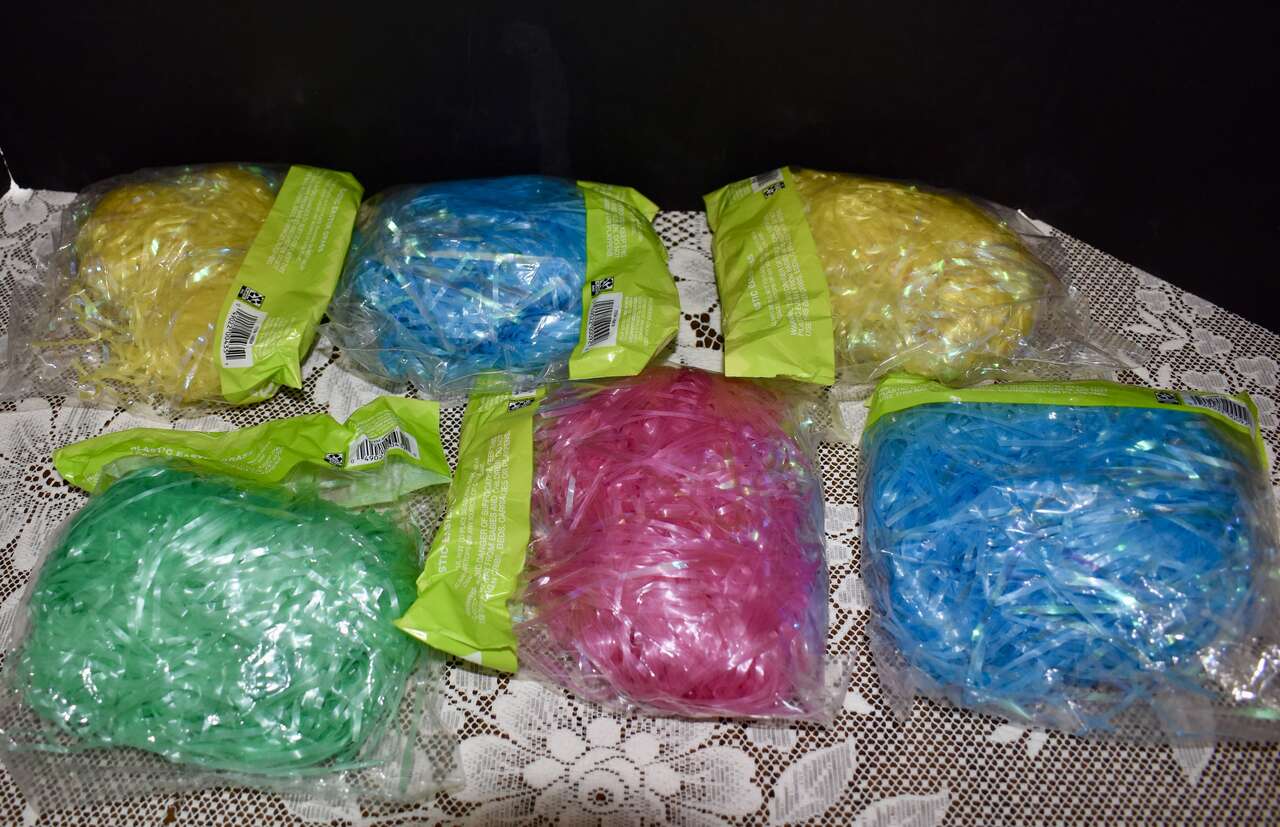 ***IT MEASURES…The Plastic Easter Pail / Buckets Measures… 8 inches tall at the tallest area at the fronts and their backs measure 6 1/4 inches tall and they are 7 1/2 inches across measured from the top from side to side. The bags of pretty plastic Easter grass are 1.5 oz.