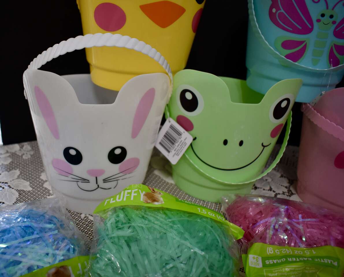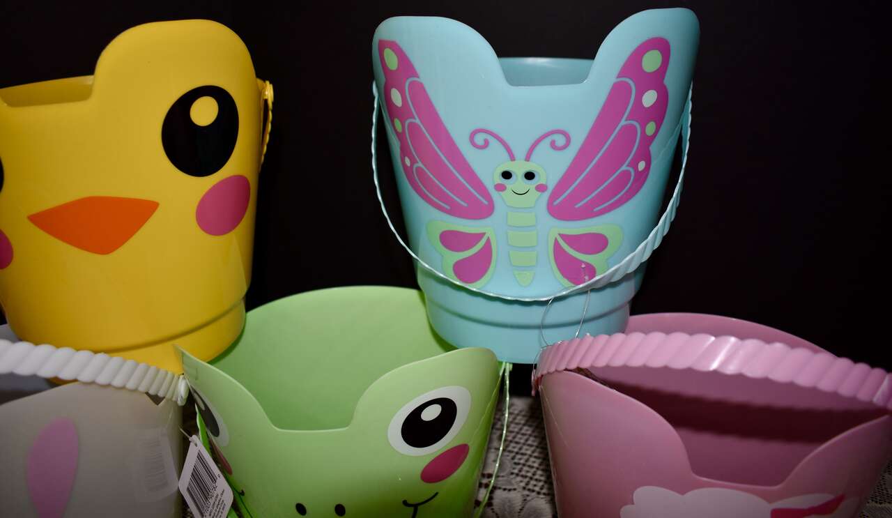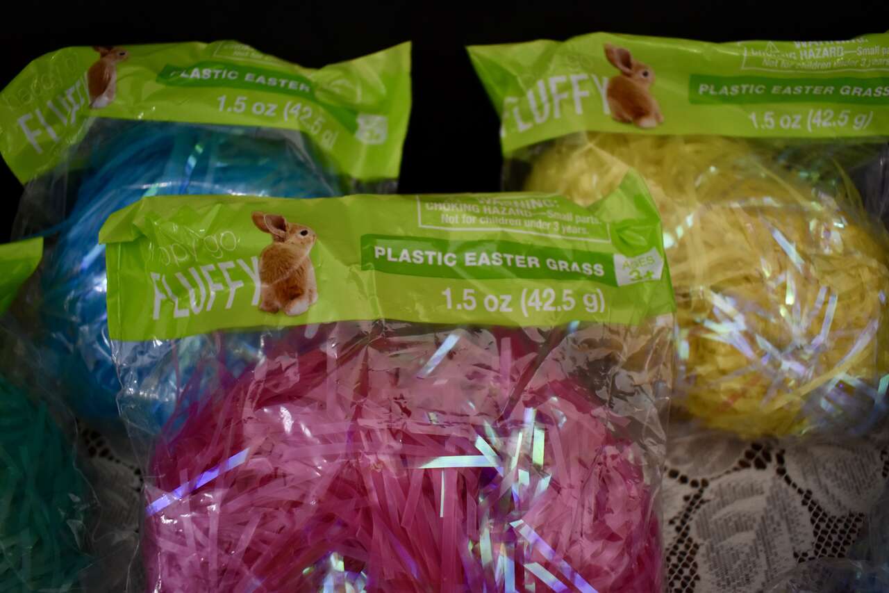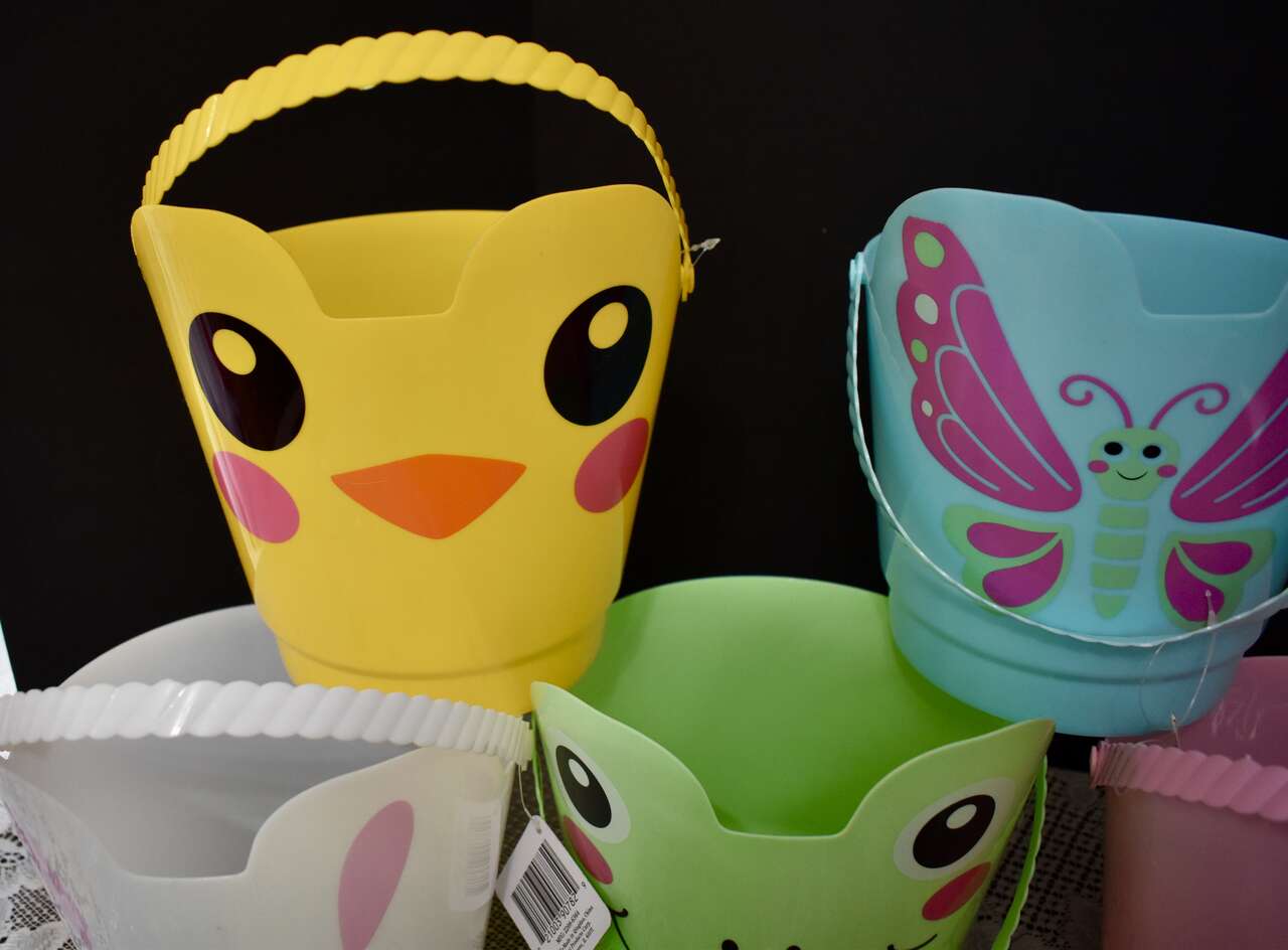 ***IT MEASURES…The Plastic Easter Pail / Buckets Measures… 8 inches tall at the tallest area at the fronts and their backs measure 6 1/4 inches tall and they are 7 1/2 inches across measured from the top from side to side. The bags of pretty plastic Easter grass are 1.5 oz.