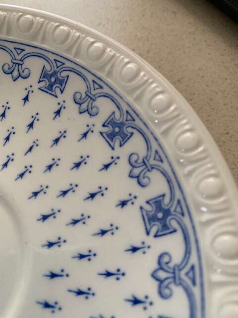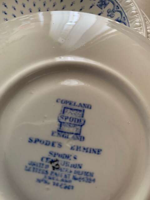 This listing is for vintage saucers about 5 7/8" in diameter made by Spode, England, in the pattern Ermine Blue, great condition. There are 8 available, $6 each.