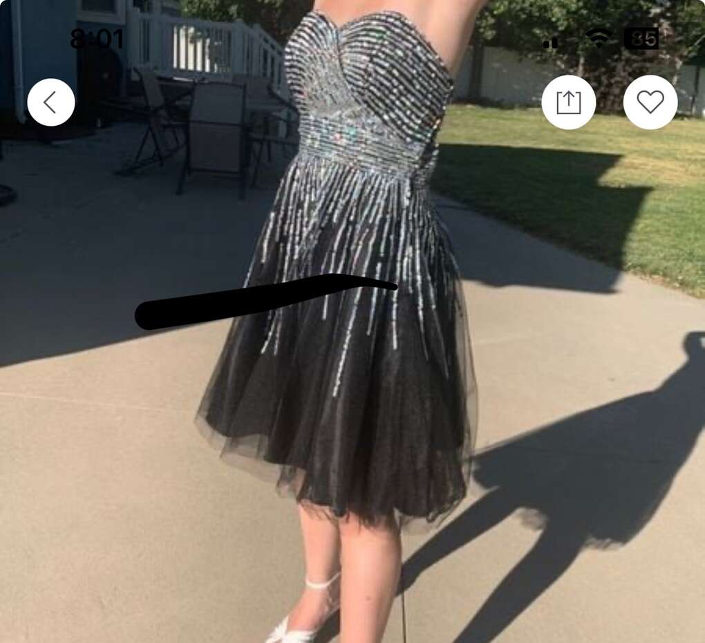 This is a short knee length dress size small with silver at the top and strapless. This is a great dress for any special occasion and twirls really nicely. Model is 5 foot and has 2 inch heels and the dress goes to her knees.