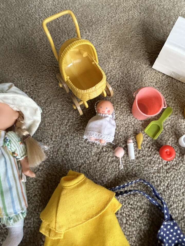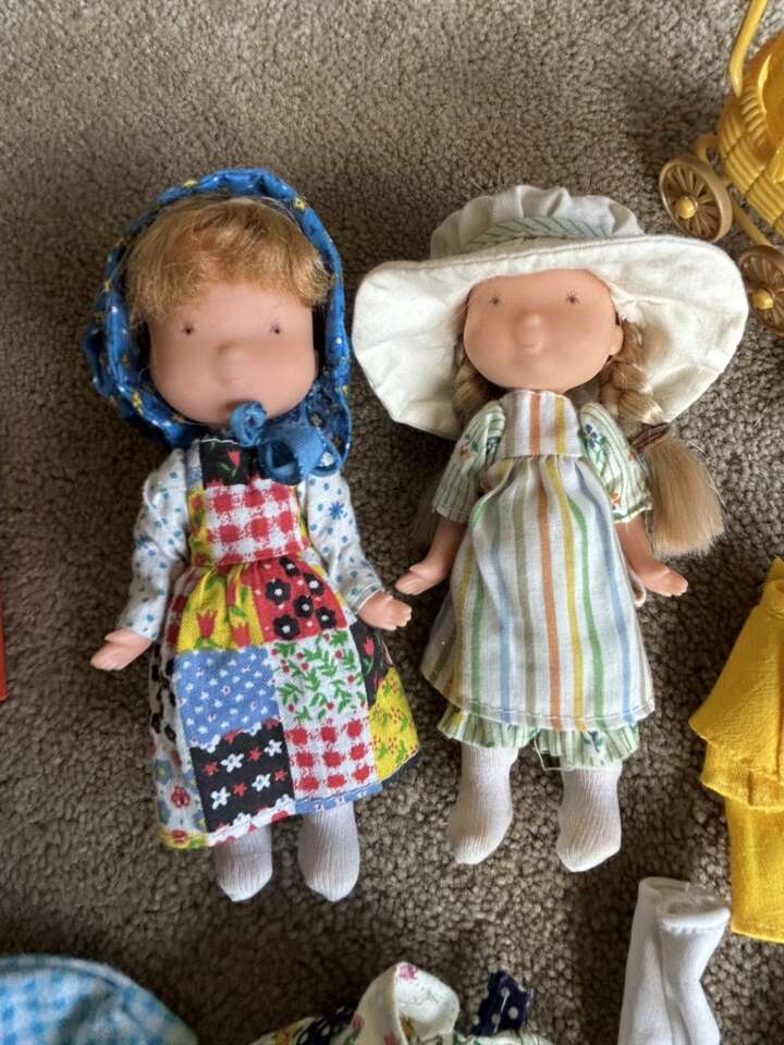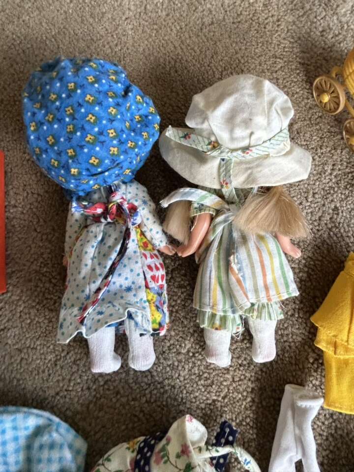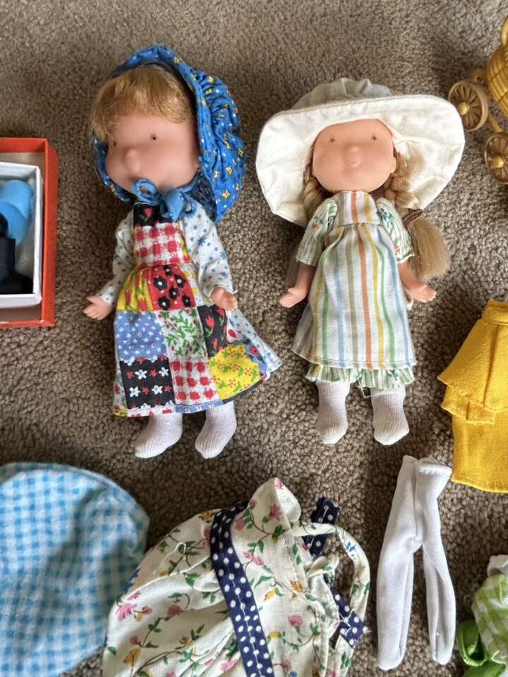 Vintage 1970s Holly Hobbie 6” Dolls, Clothes, & Accessories. Includes everything shown in photos: two dolls in original complete outfits, extra outfits, shoes, baby with carriage, toys, bucket & shovel, picnic basket with plates & cups, cloths, and hammock. All in very good vintage condition. Text only. Cash or Venmo.