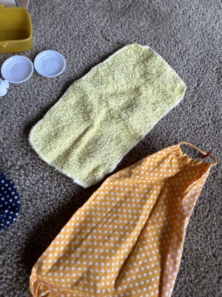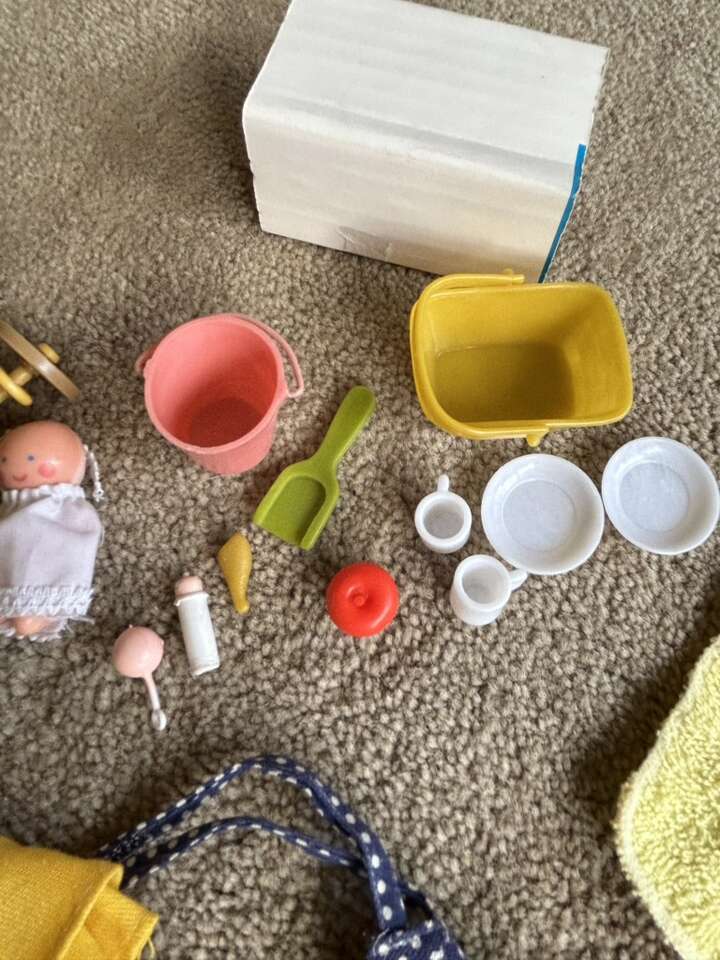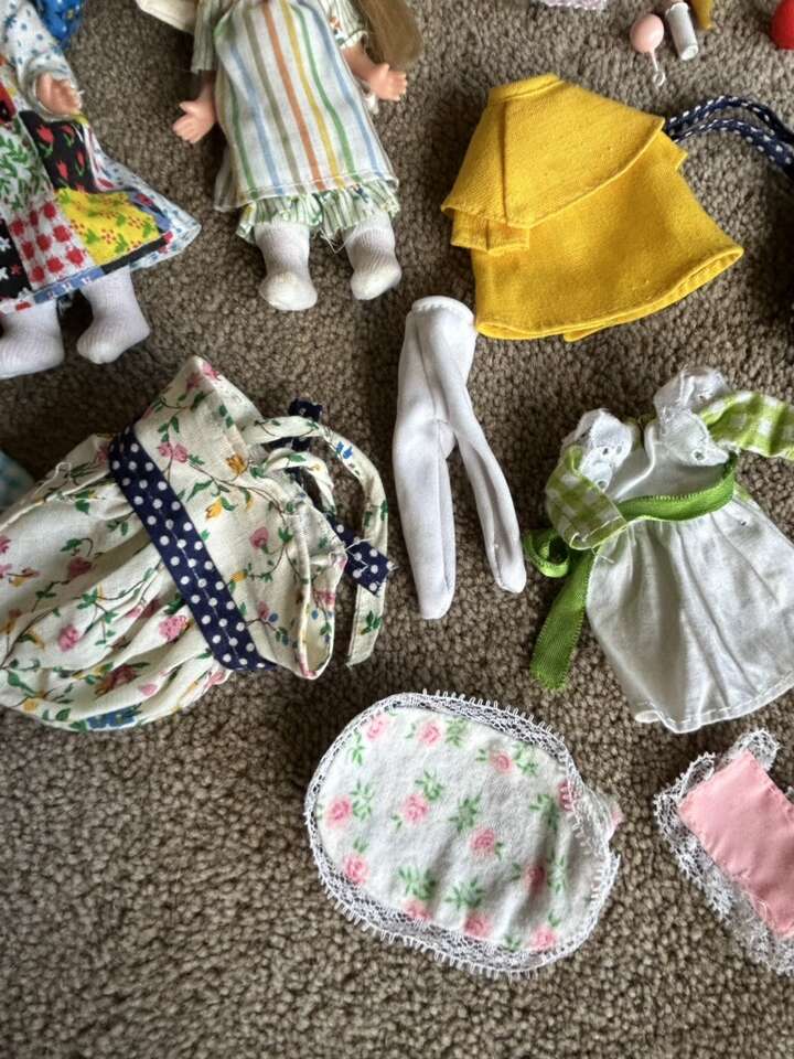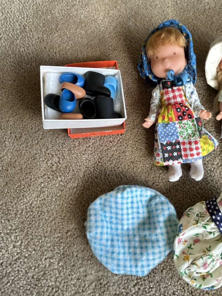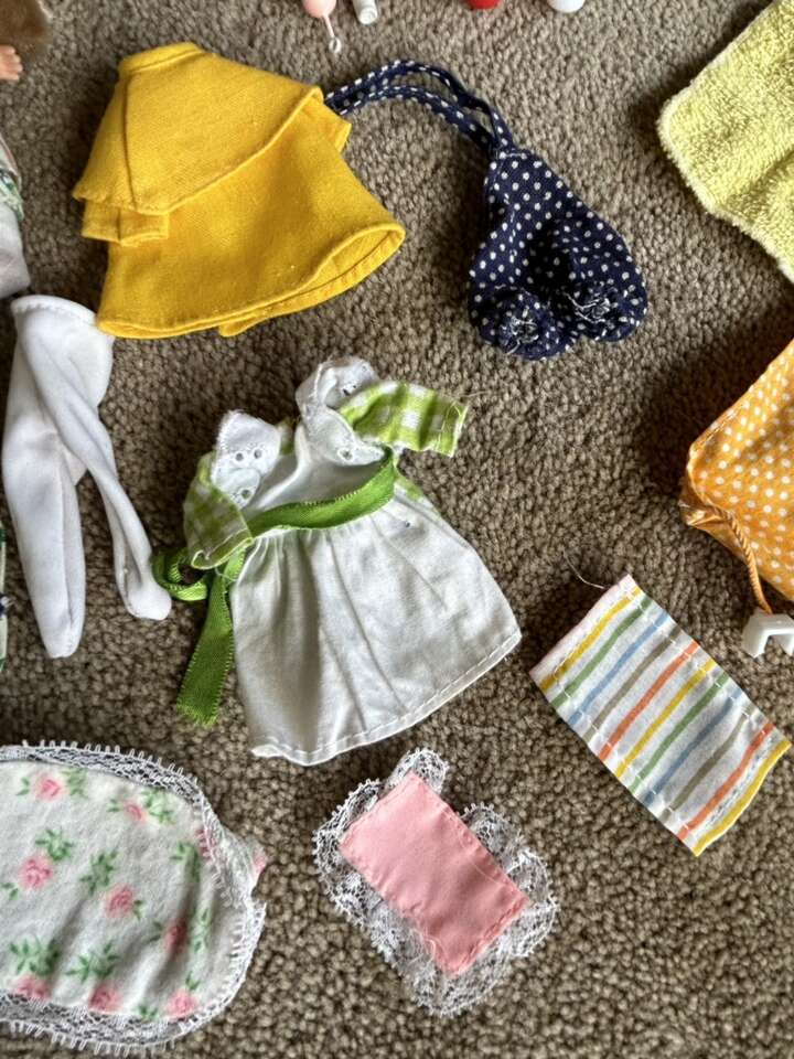 Vintage 1970s Holly Hobbie 6” Dolls, Clothes, & Accessories. Includes everything shown in photos: two dolls in original complete outfits, extra outfits, shoes, baby with carriage, toys, bucket & shovel, picnic basket with plates & cups, cloths, and hammock. All in very good vintage condition. Text only. Cash or Venmo.